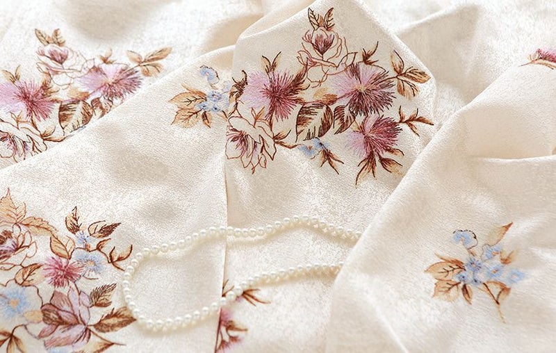 刺繍部分の立体感だけでなく、ベースの生地も織り感のあるものを使用することで、より奥行きを感じる華やかデザインに。