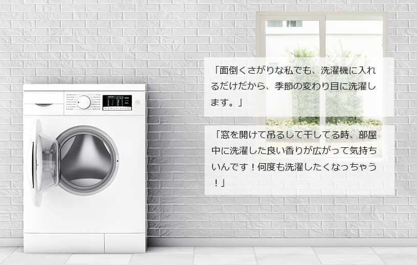 生地に付着した汚れを、洗濯機で落ちやすいよう加工を施されているため、綺麗好きさんには必須機能。外気やほこりなどで汚れてしまうカーテンでも、ウォッシャブルだと洗えて清潔を保てるのはとっても嬉しいですよね。また、再汚染しにくいのも良い!