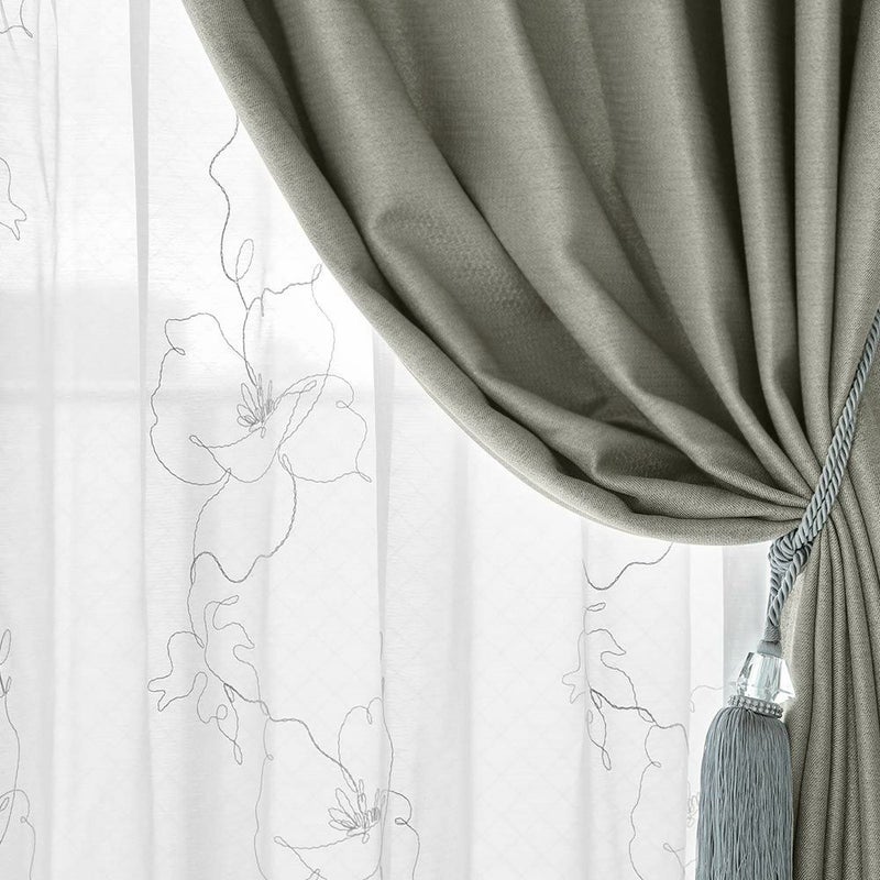 撮影コーディネート: タッセル<ブリエ グレー>、 レースカーテン <ロエル ホワイト>ファッションを楽しむように、カーテンにもアクセサリーをつけて、おしゃれで完成度の高い窓辺を演出します。 大きな宝石のようなモチーフが付いたタッセルをコーディネートすれば、素敵なインテリアのアクセント。 カーテンをラフにまとめてできた、たっぷりとしたドレープが、なんとも愛しい光景に。
