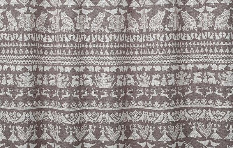 愛や尊敬に基づく、伝統的なフィンランドのライフスタイル。神秘的なフィンランドのモチーフを表現した、北欧デザインカーテンです。古くから森と共存してきた人間と動物たち。そんな暮らしを柄に落とし込み、夜の森をフォークロア調のかわいいモチーフでデザインしました。
