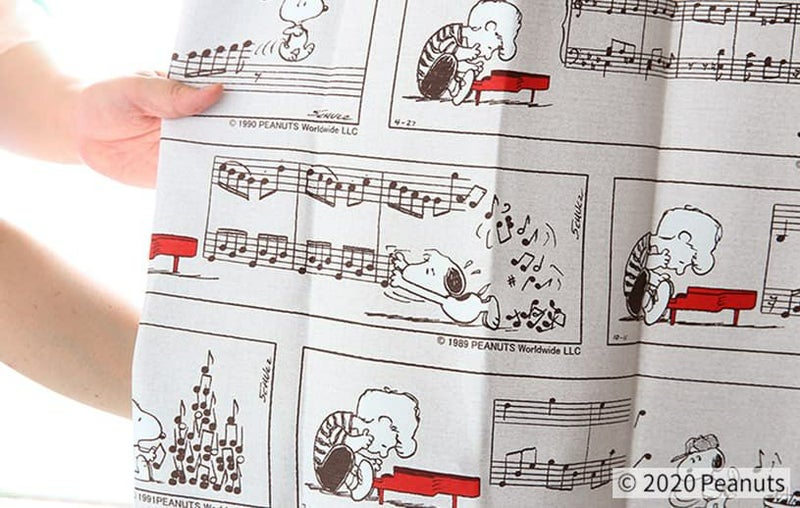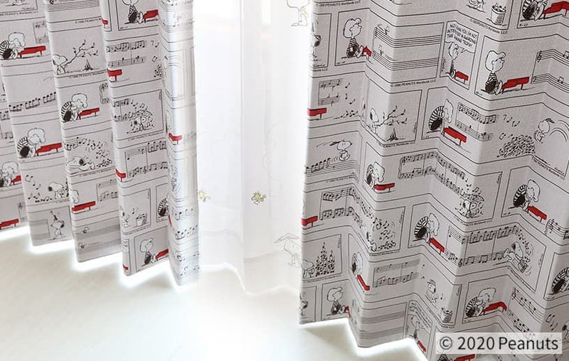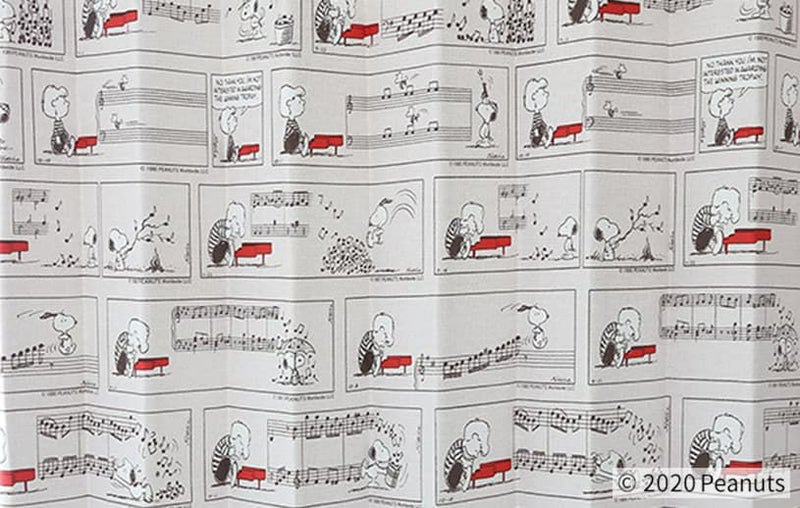 スヌーピーとシュローダーとのやりとりが一面に描かれたカーテン