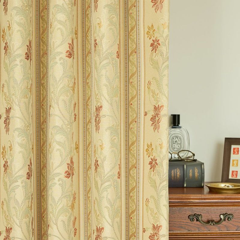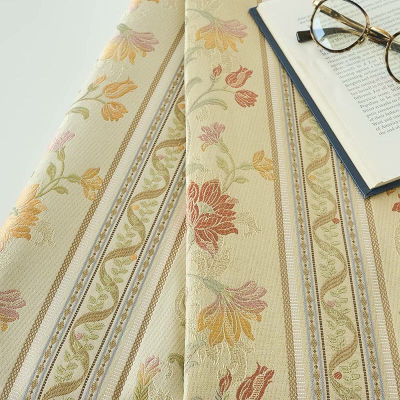 高貴なムードを引き立てるベージュと、窓辺にやさしい華やかさをもたらすイエローの2色をラインナップしました。どちらもアンティークな空間にぴったりのカラーに仕上げています。贅沢なデザインでありながら、ひと味違うセンスが感じられる一枚です。