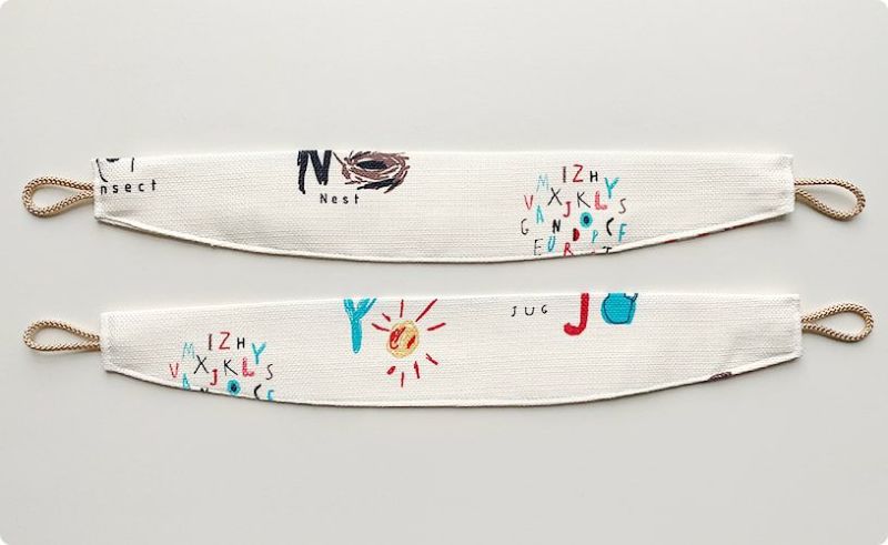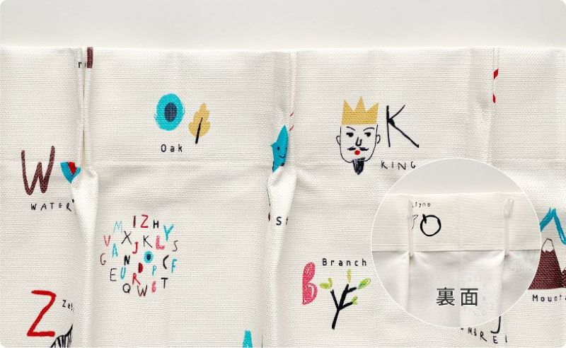 アルファベットと一緒に可愛い絵がデザインされたカーテン。