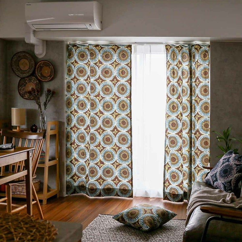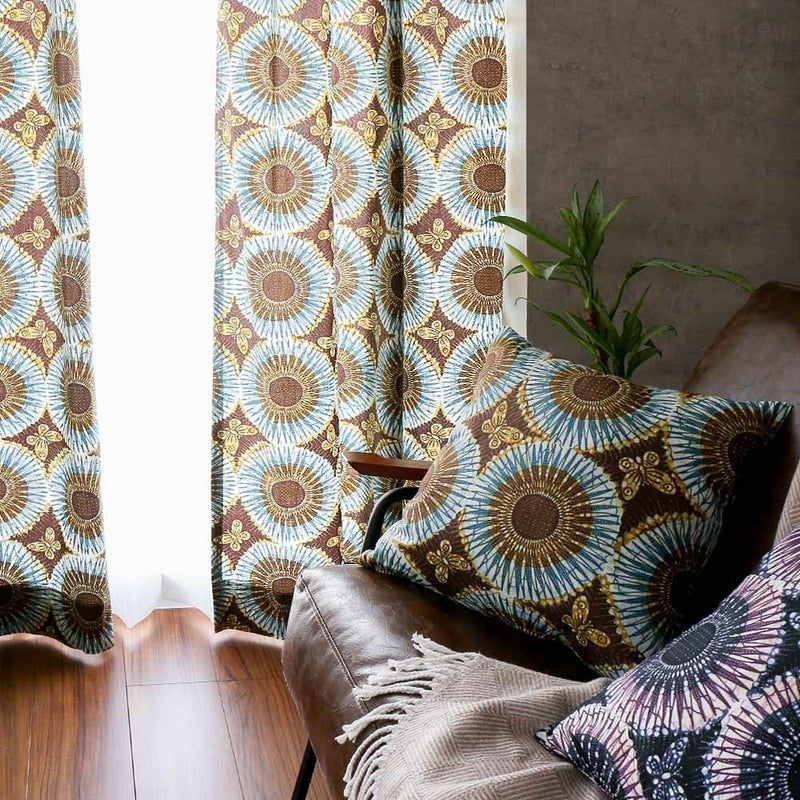 【撮影コーディネート】レースカーテン<デレン> ホワイト独特の色使いと、同じ模様が並んだインパクトのあるテキスタイル。アフリカンバティックをプリントで表現した当店オリジナルのクッションカバーです。