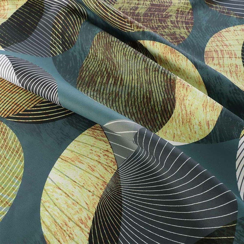 アフリカンプリントをベースに、モード感をプラスすることで洗練されたムードに。ポイントはユニークで独特なモチーフながらも、繊細な表現で描かれていること。重なり合った月の満ち欠けのようなサークルモチーフ、線と線、モヤのようなぼかしタッチをインクジェットプリントで表現。深みがあり、高級感たっぷりの仕上がりに!