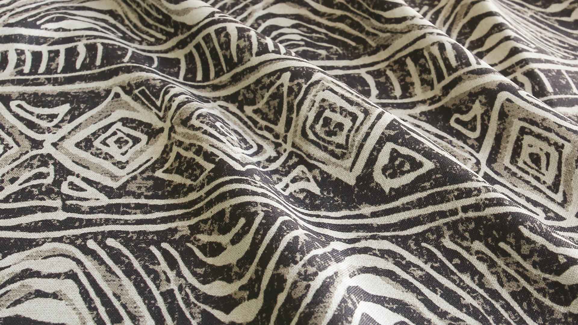 アフリカの伝統的なテキスタイル「泥染布(ボゴランフィニ)」をアレンジし、ヴィンテージ感をプラス。まるで代々受け継がれ、大切に使われてきたファブリックのような「こなれ感」を表現しました。かすれ感のある、ラフな手描きタッチが素朴な雰囲気を漂わせます。