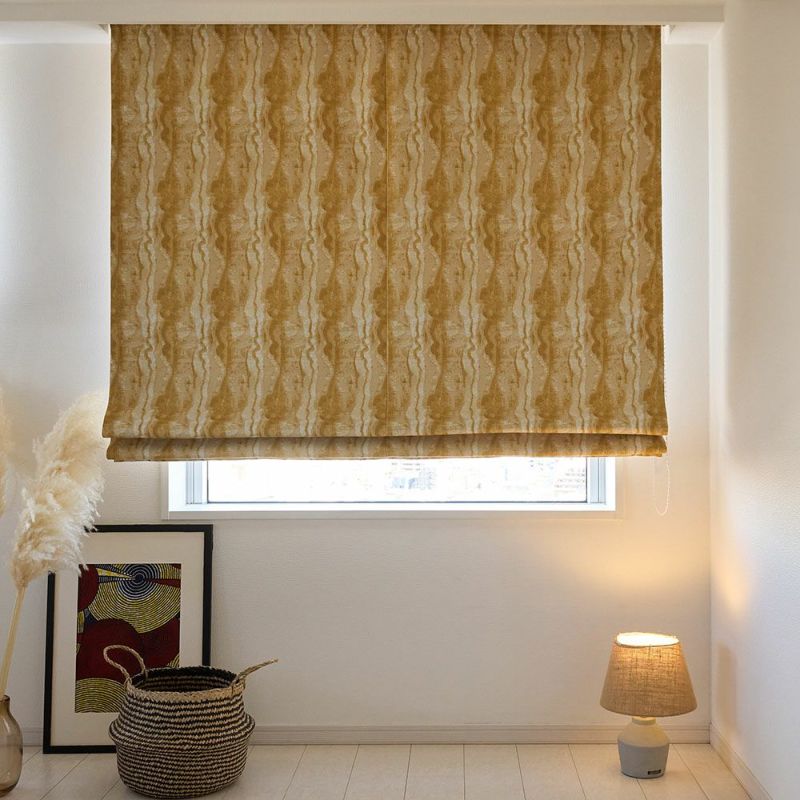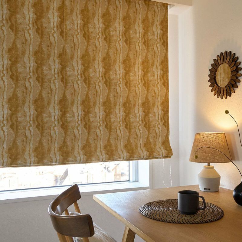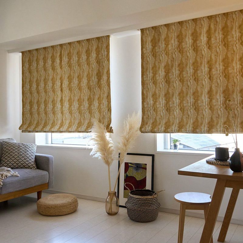 凛とした佇まいが美しいアフリカンカーテン。アンティークゴールドを思わせるくすみイエローで描いたタイダイ柄は、素朴なラタンやヴィンテージ家具との相性も抜群。 ワンランク上の大人なアフリカン空間を作ってくれるお洒落なシェードカーテンです。