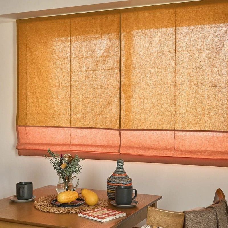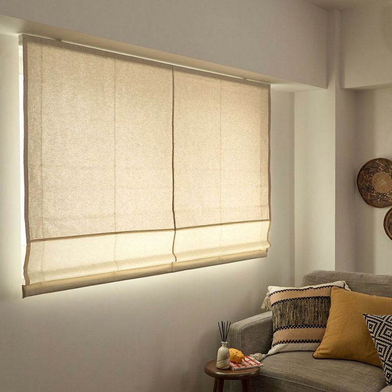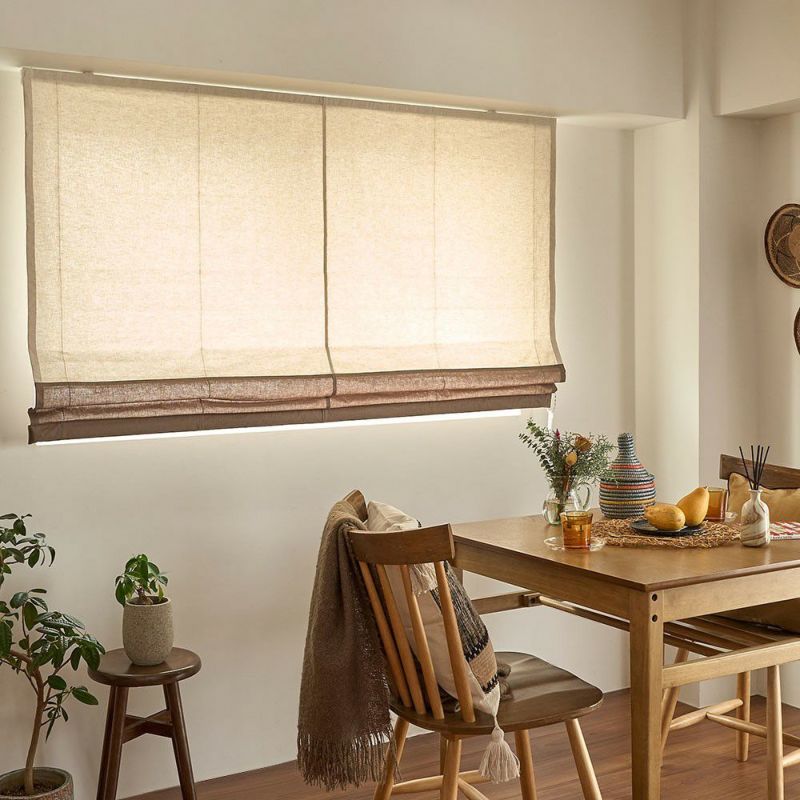 シェードは、高さで調整できるので、日よけや目隠しとして使いやすいところもポイント。シャキッとしたハリ感があるコットンリネンの生地は、引き上げるとコンパクトに折りたたまれて、すっきりした見た目に。