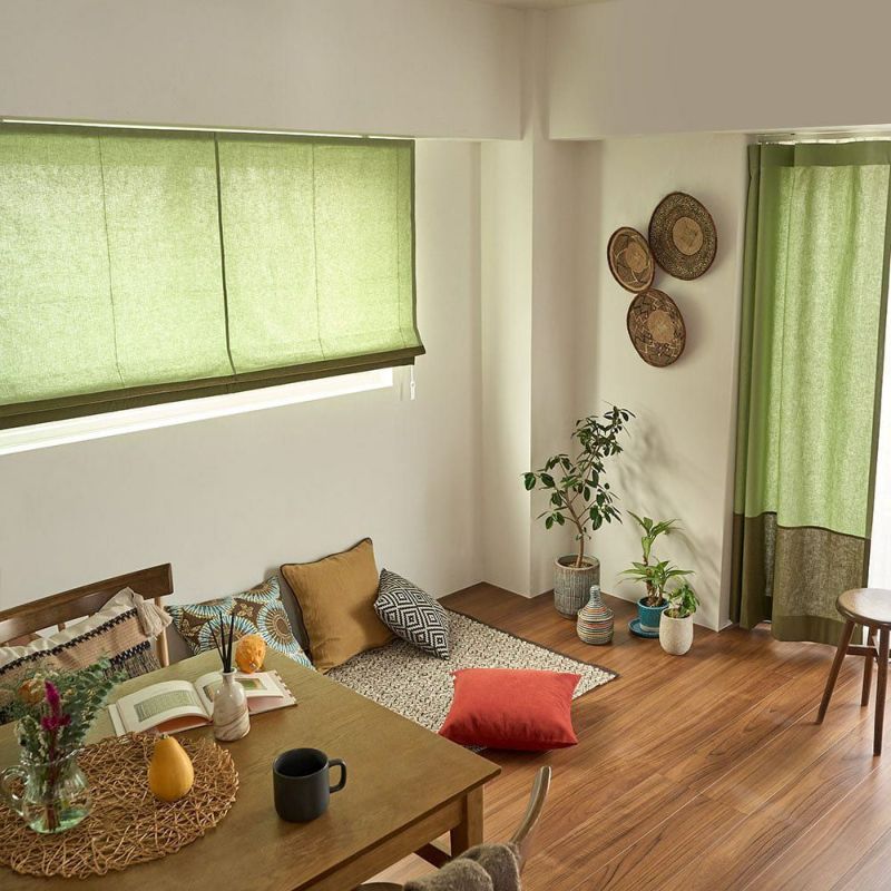 同じデザインのカーテンもご用意しました。お部屋をすっきりとした統一感を出したいときにはお揃いコーデがおすすめ。ダイニングには「マンゴープリン」、リビングには「キウイ」、寝室には「バニラミルク」みたいに、お部屋によってテーマカラーを決めても素敵です。