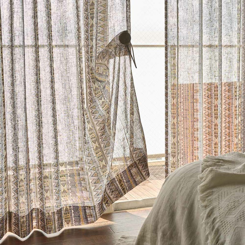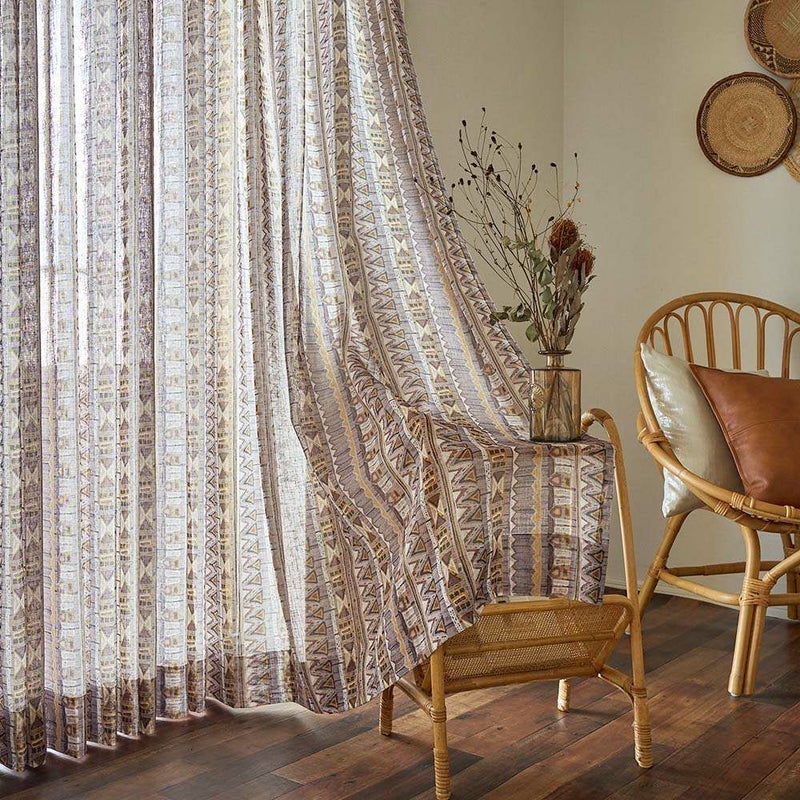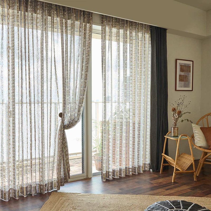 レースカーテンはシンプルな無地を選びがち。でももう少し気分を上げたいときには、こんなナチュラル感のあるアフリカン柄はいかがでしょうか? アフリカンテキスタイル好きのお洒落心をぐっとつかむ、いちおしのレースカーテンです。 -