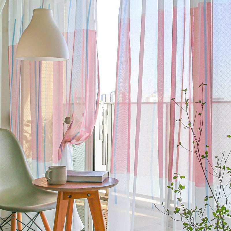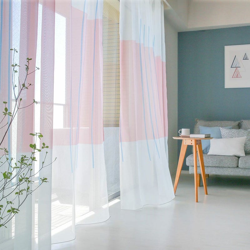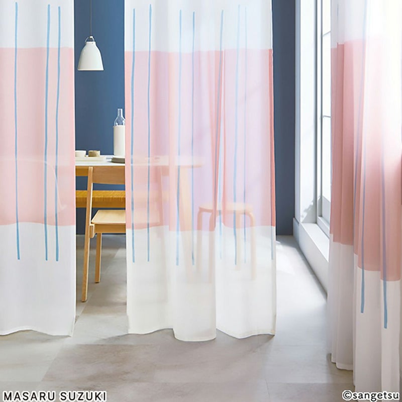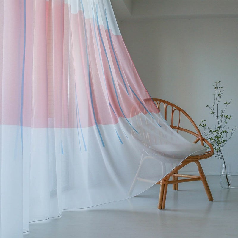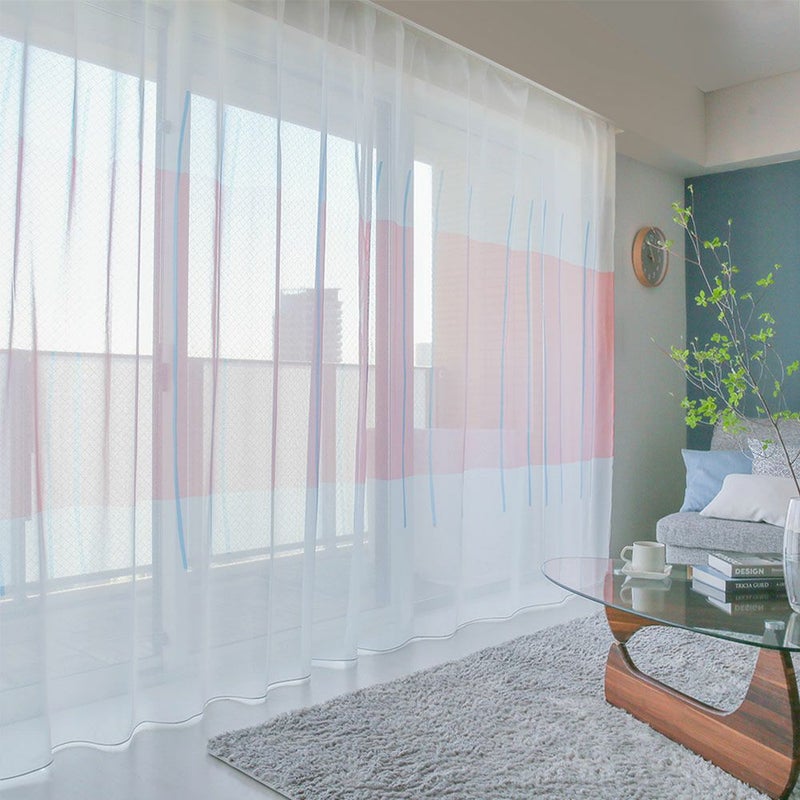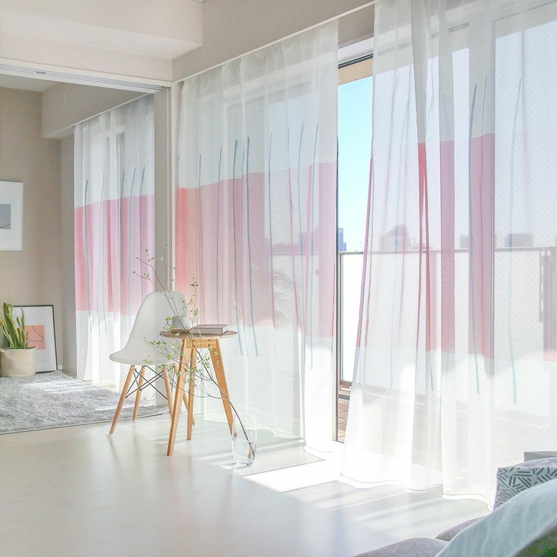 光に透けたアートなカーテンに囲まれた部屋は、まるで小さな美術館!カラーのアクセントクロスに合わせてもお洒落です。 -