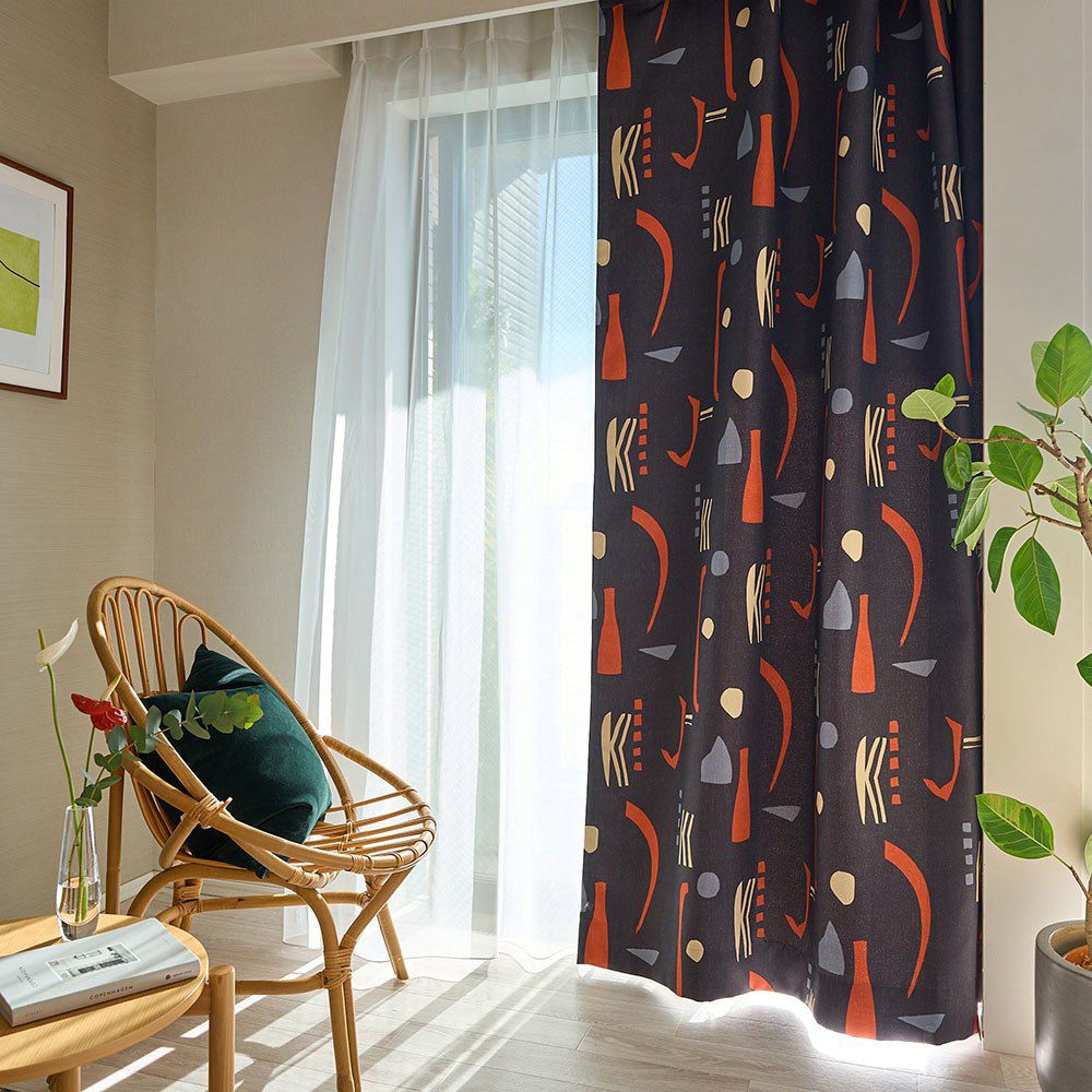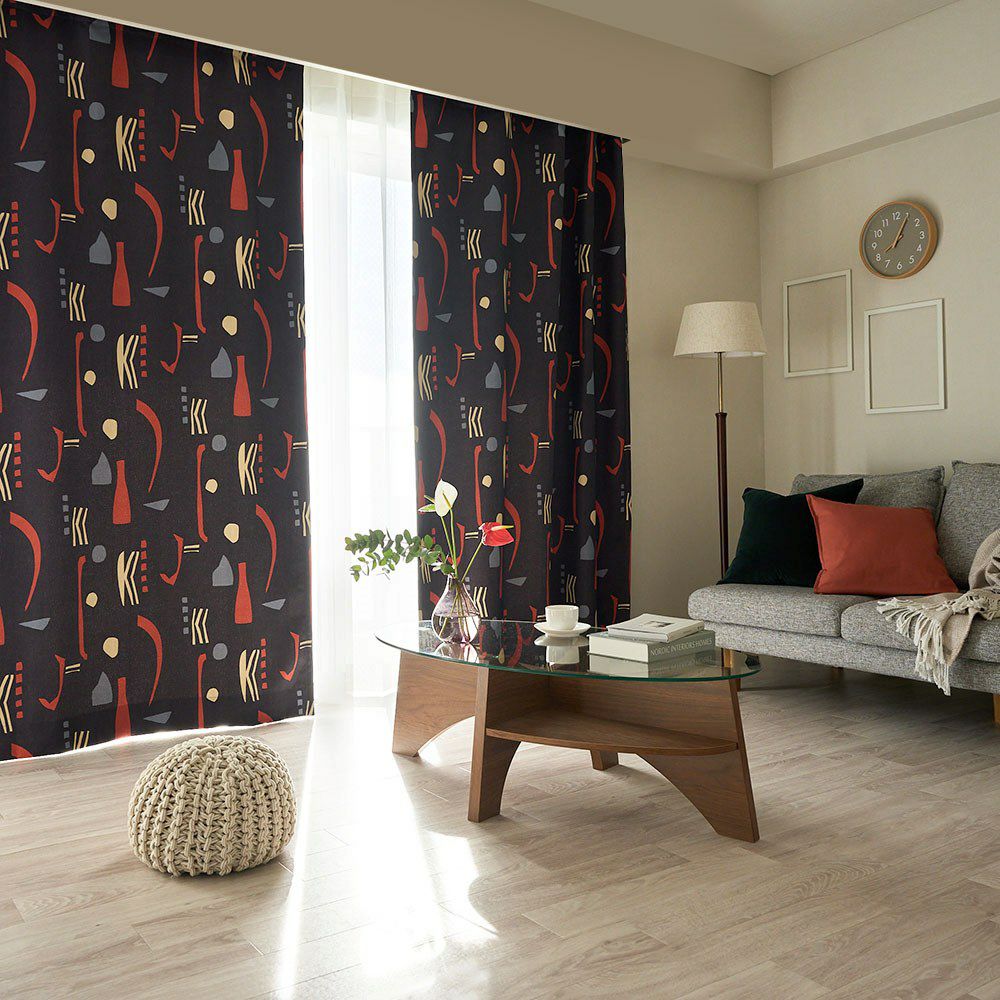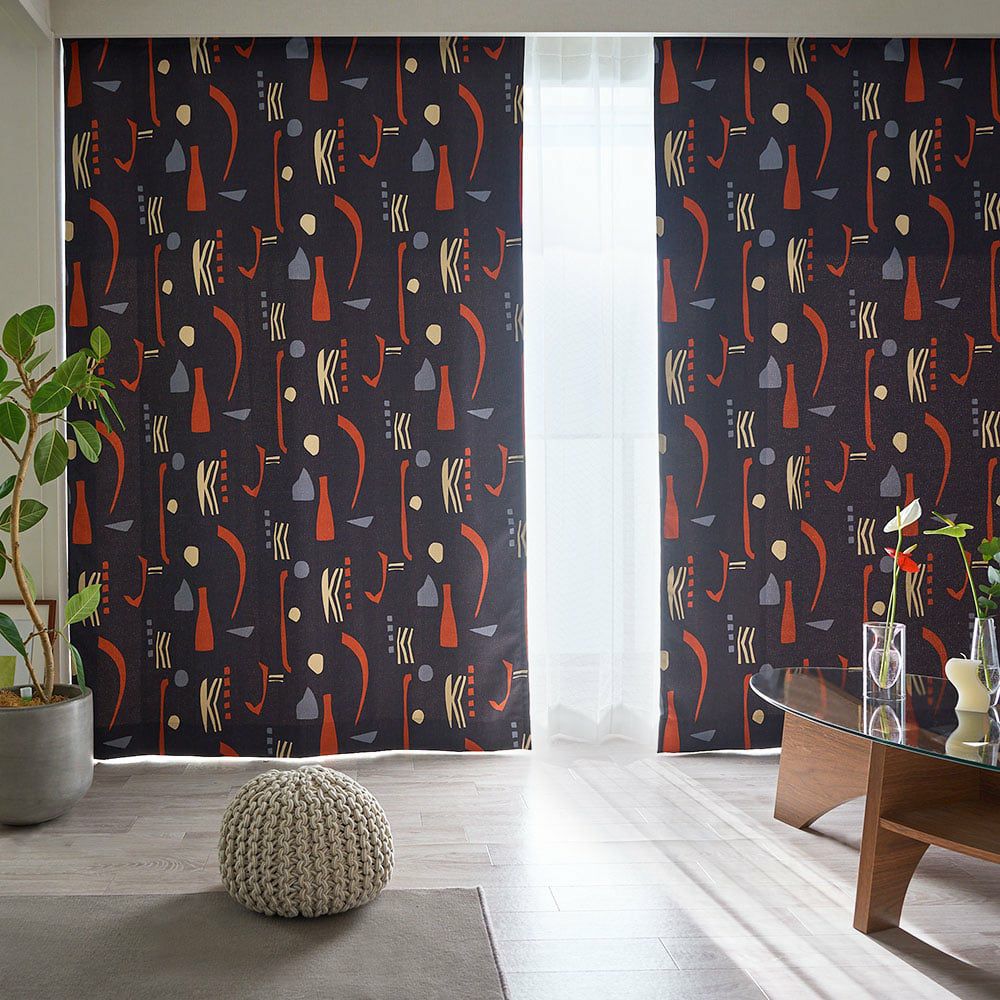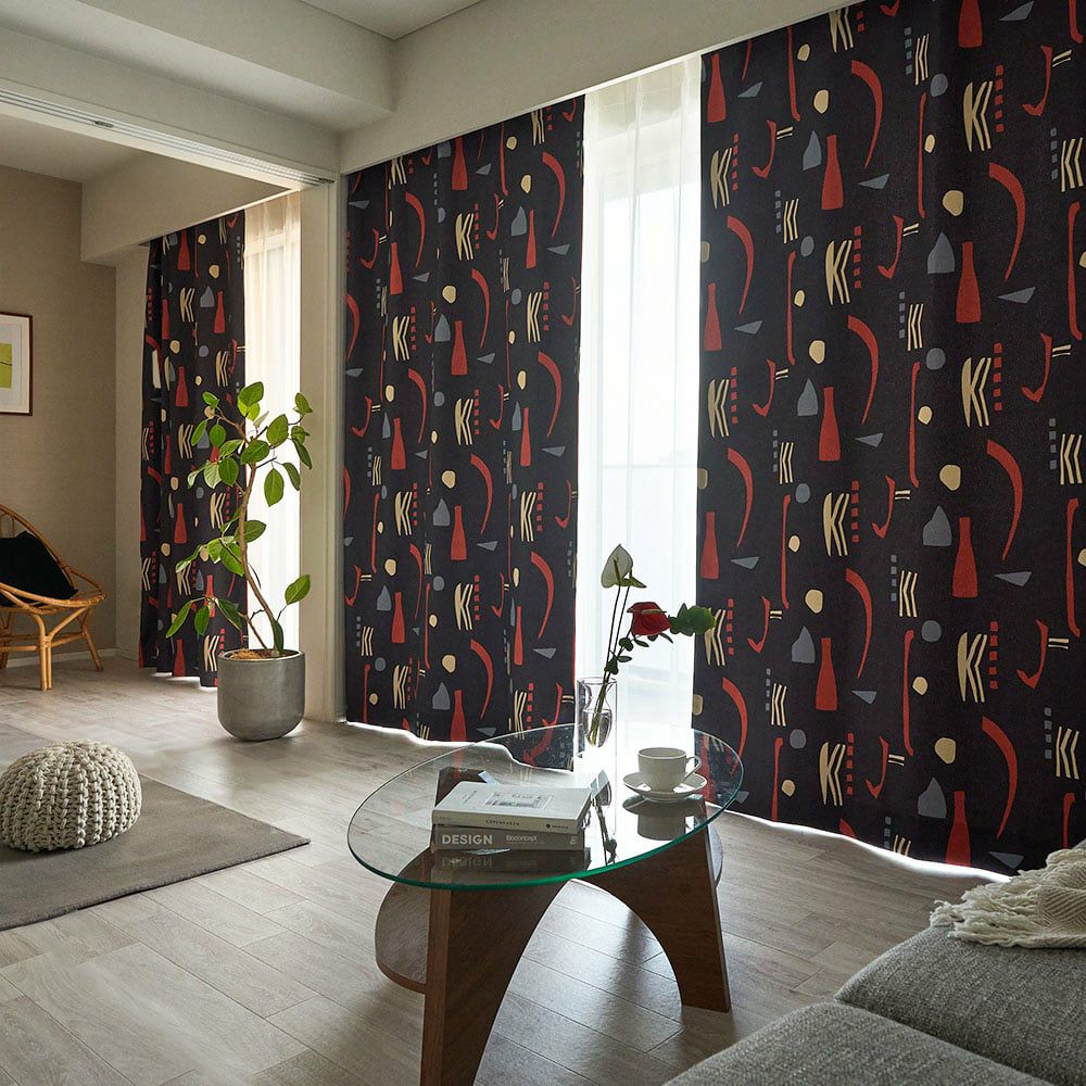 ミッドセンチュリースタイルの当店オリジナルカーテンが登場! ブラックに鮮やかなレッドが映える、インパクトのあるカラーリングがかっこいい。 他とは違う個性的なインテリアを作りたい方にぴったりの、まさにアート作品のような1枚です。