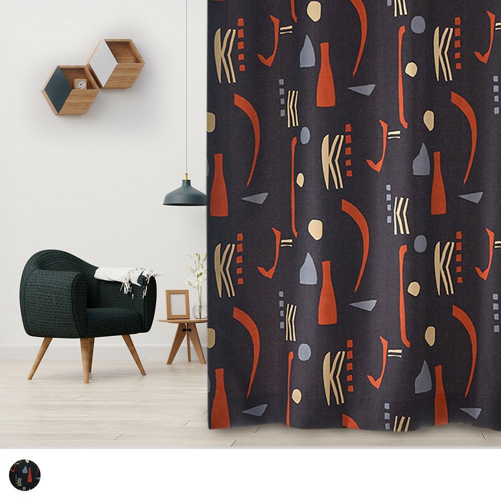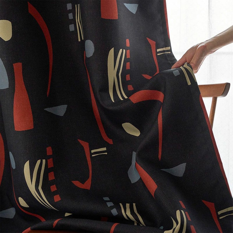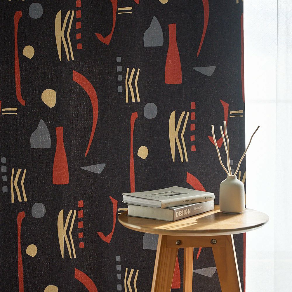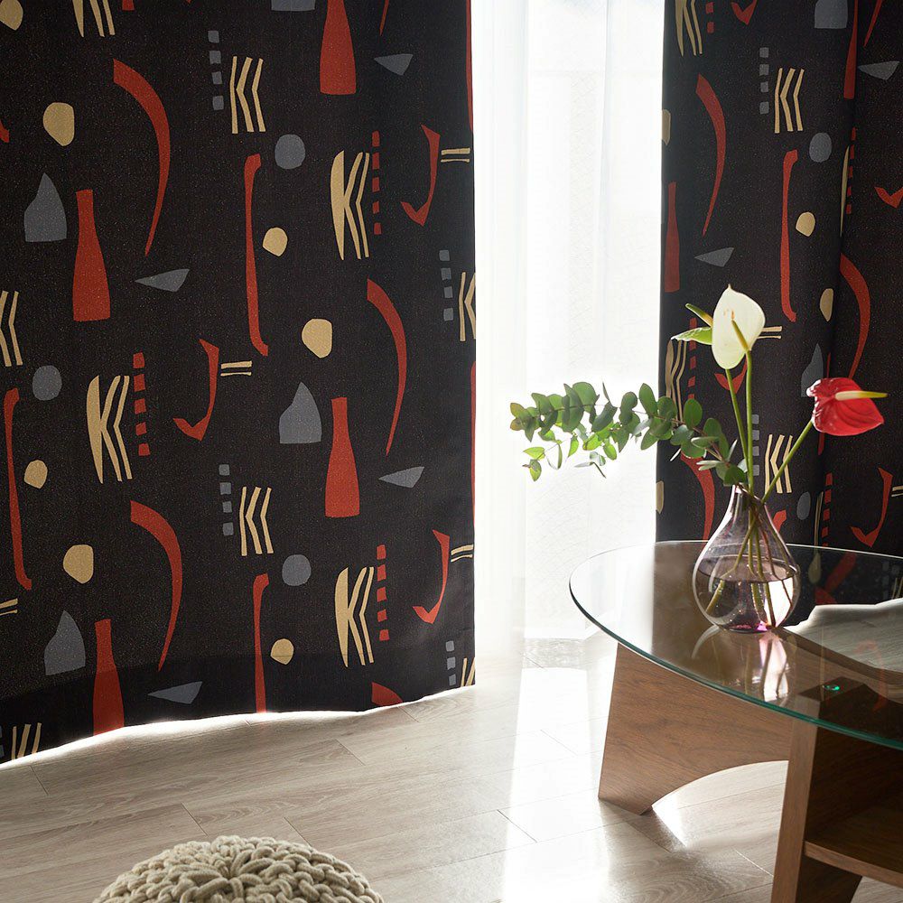 ミッドセンチュリースタイルの当店オリジナルカーテンが登場! ブラックに鮮やかなレッドが映える、インパクトのあるカラーリングがかっこいい。 他とは違う個性的なインテリアを作りたい方にぴったりの、まさにアート作品のような1枚です。