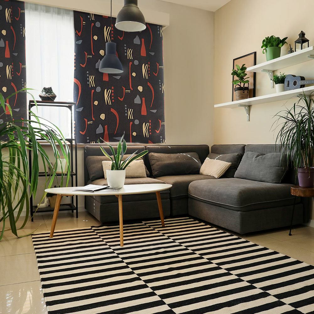 「アートなプリント柄のカーテン×ジオメトリックなラグ」。ブラックをキーカラーにした、こんな柄同志のコーディネートもお洒落です。