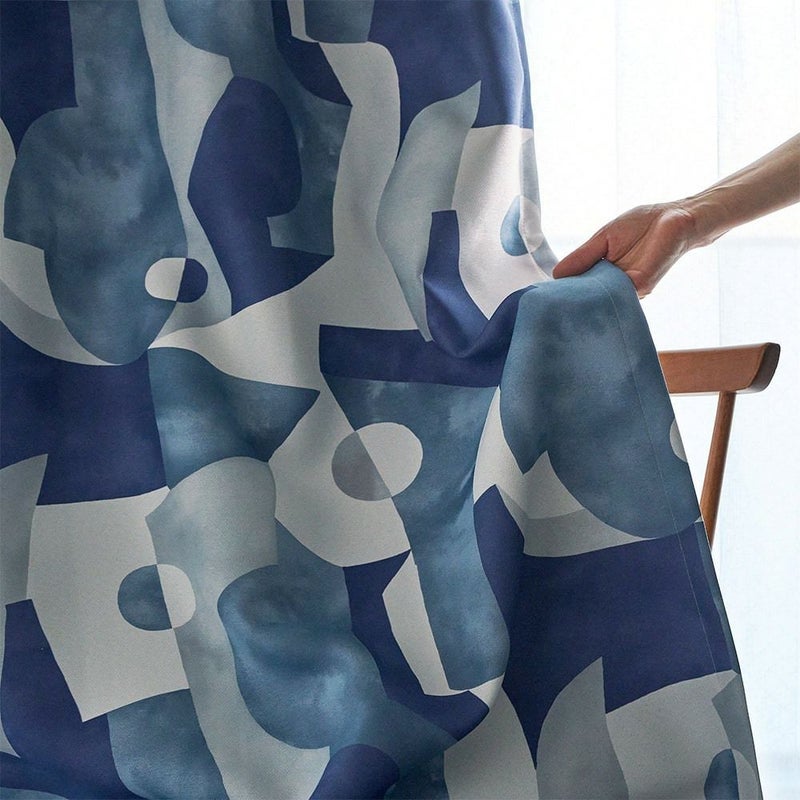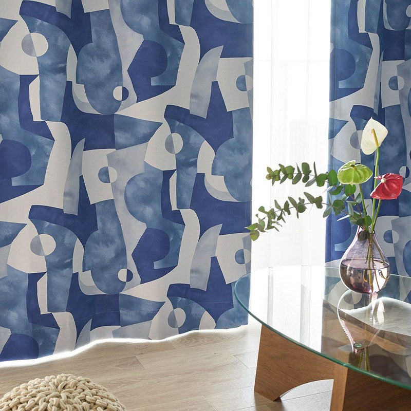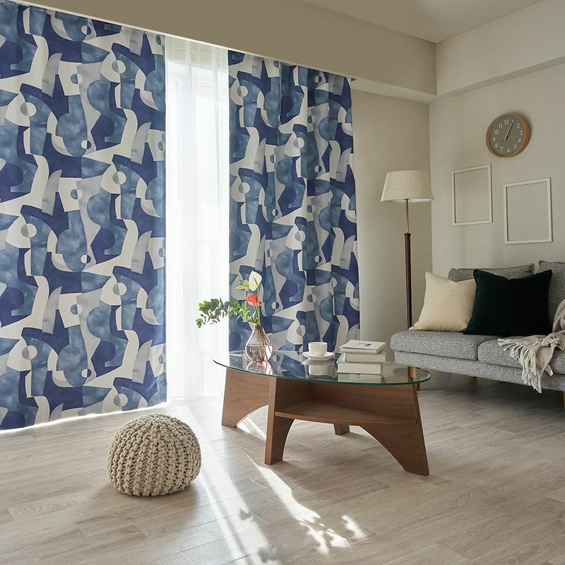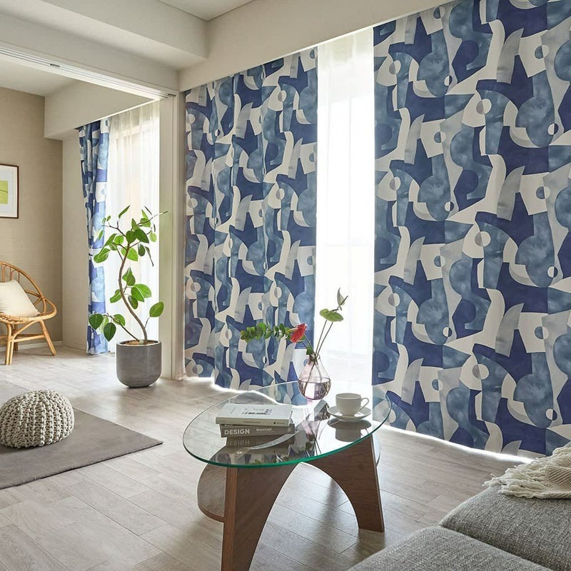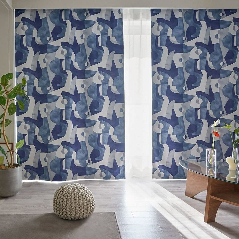 ユニークな抽象柄をブルーだけで描いた、クールなアートカーテンが登場。モダンなアート空間にも北欧インテリアにも映える、アートカーテンです。