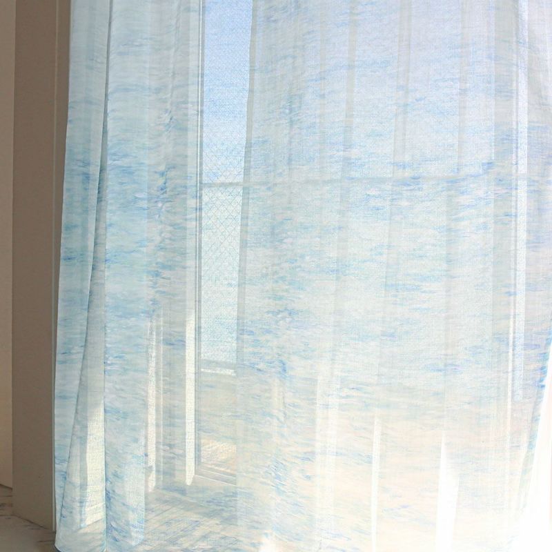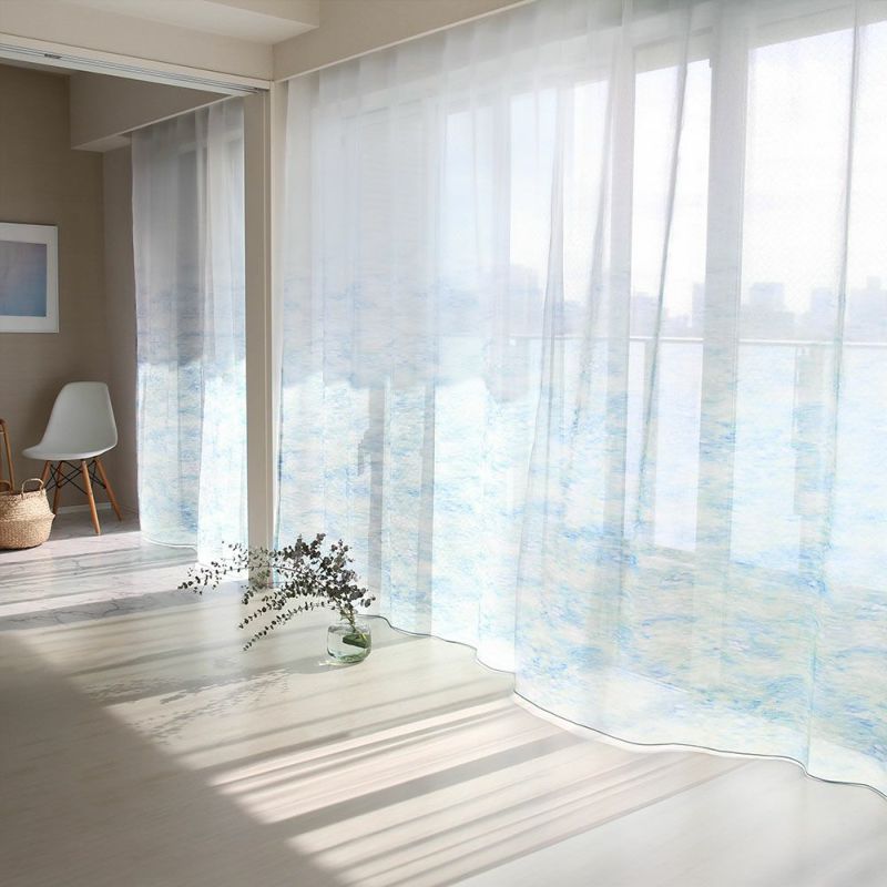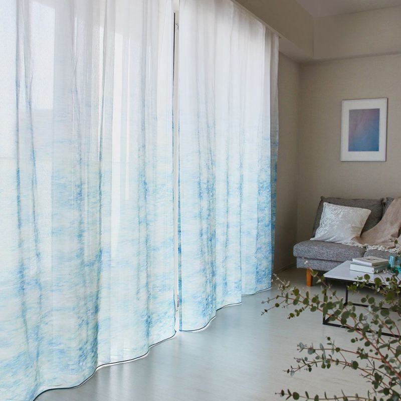 まるで1枚の大きなアートを飾るような贅沢な空間を作ってくれる、レースカーテン。どこまでも続くブルーのパネル柄は、ダイナミックな自然の中にいるようなリラックスした気分にしてくれます。
