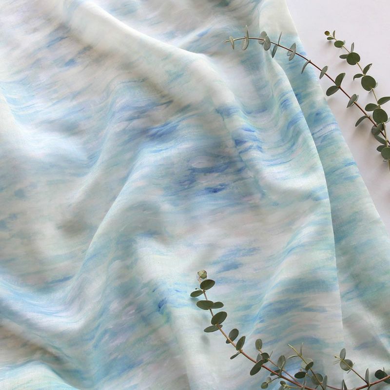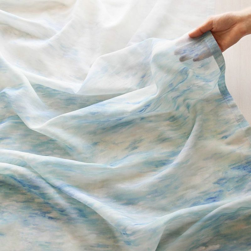 水面を思わせる風景を水彩画タッチで抽象的に描いたボイルプリント。アクアブルーのグラデーション、裾に広がる大胆なパネル柄を眺めると、ゆったりとした心地よさに包まれます。