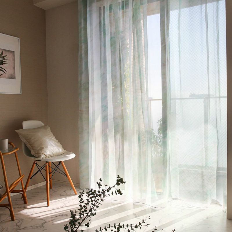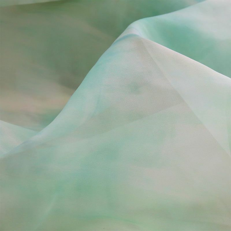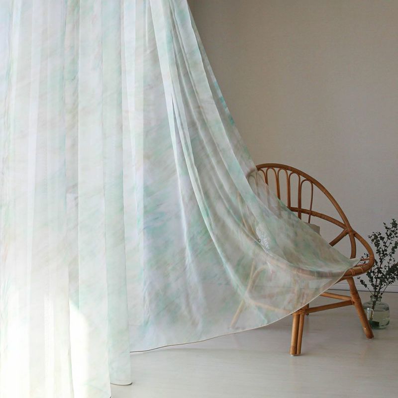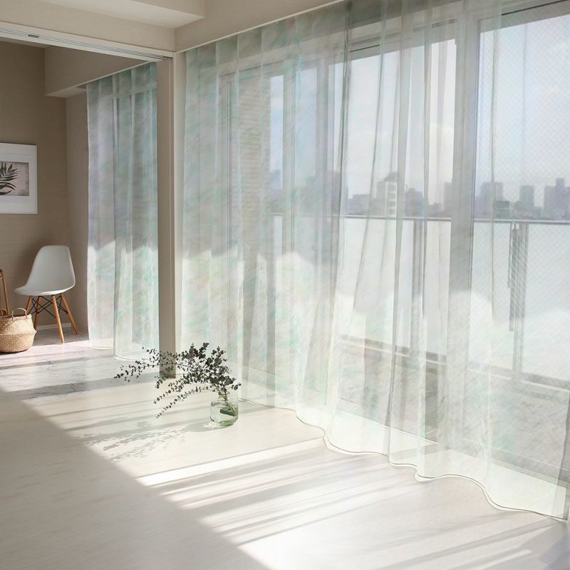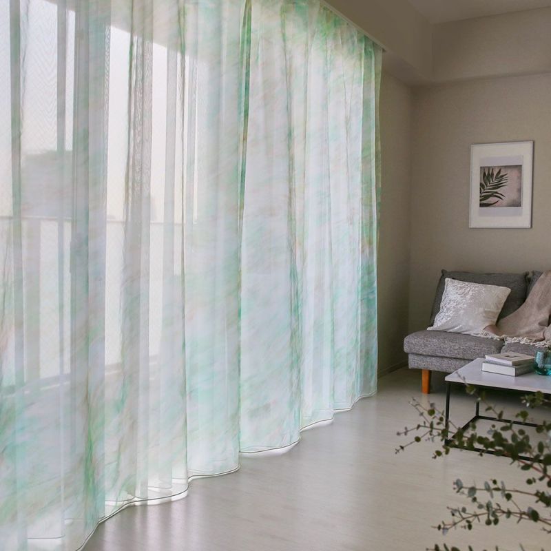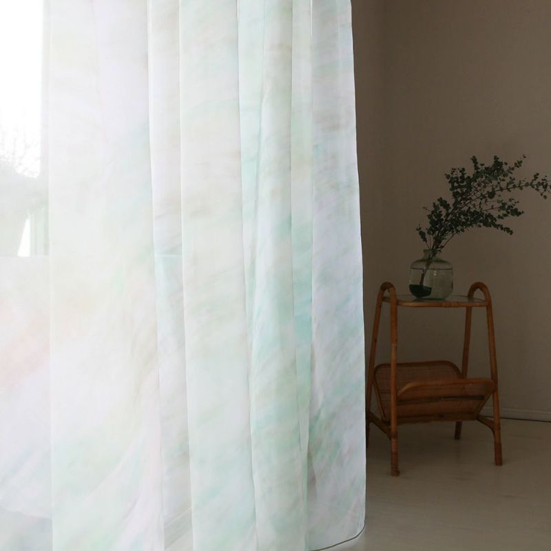 感性に響く1枚のアートを窓いっぱいにして眺める、そんな贅沢な気分を味わえるレースカーテンです。ミントグリーンで描いたぼかしのデザインは、まるで清々しい草原の中にいる気分に。