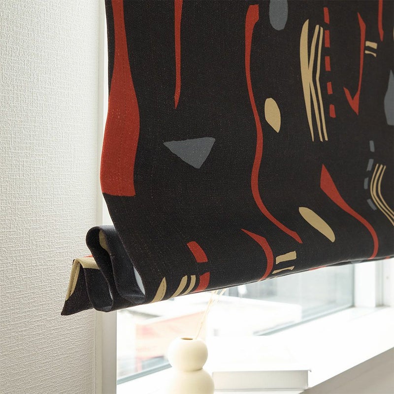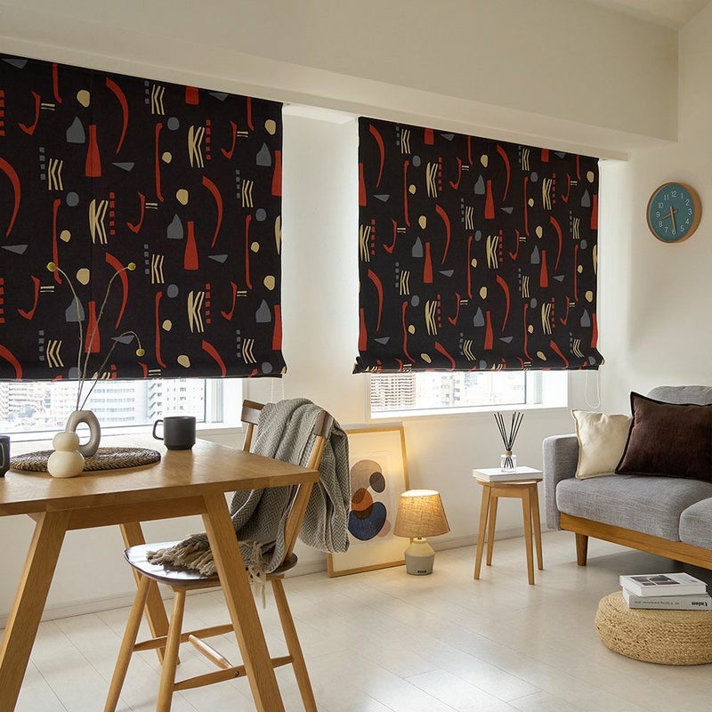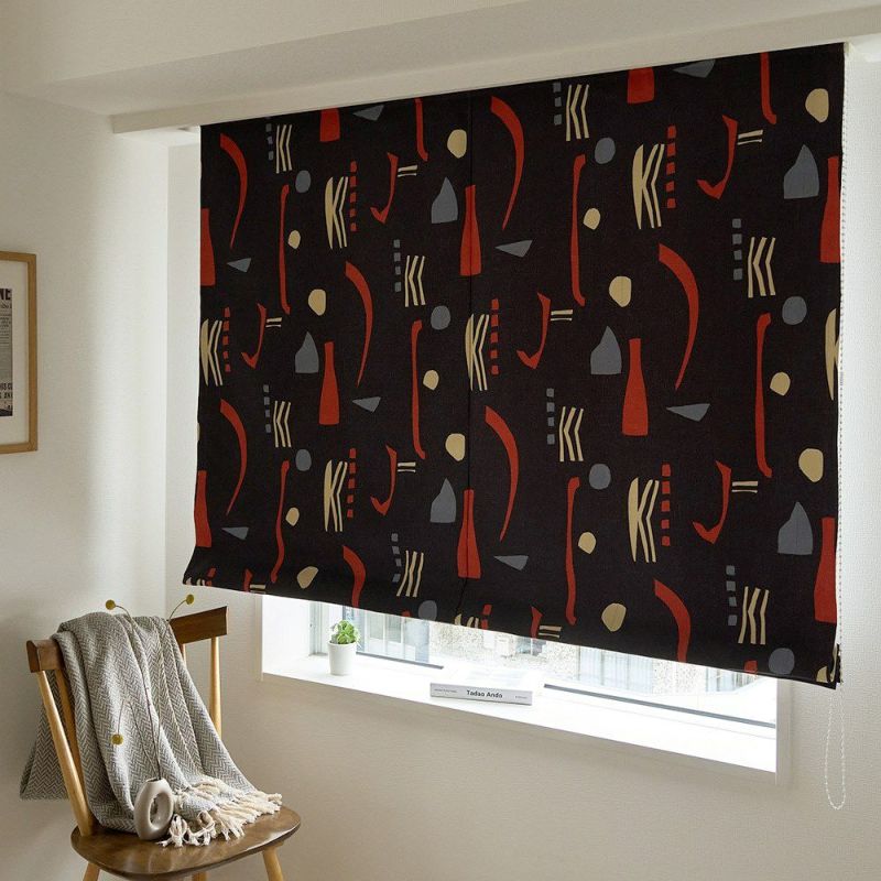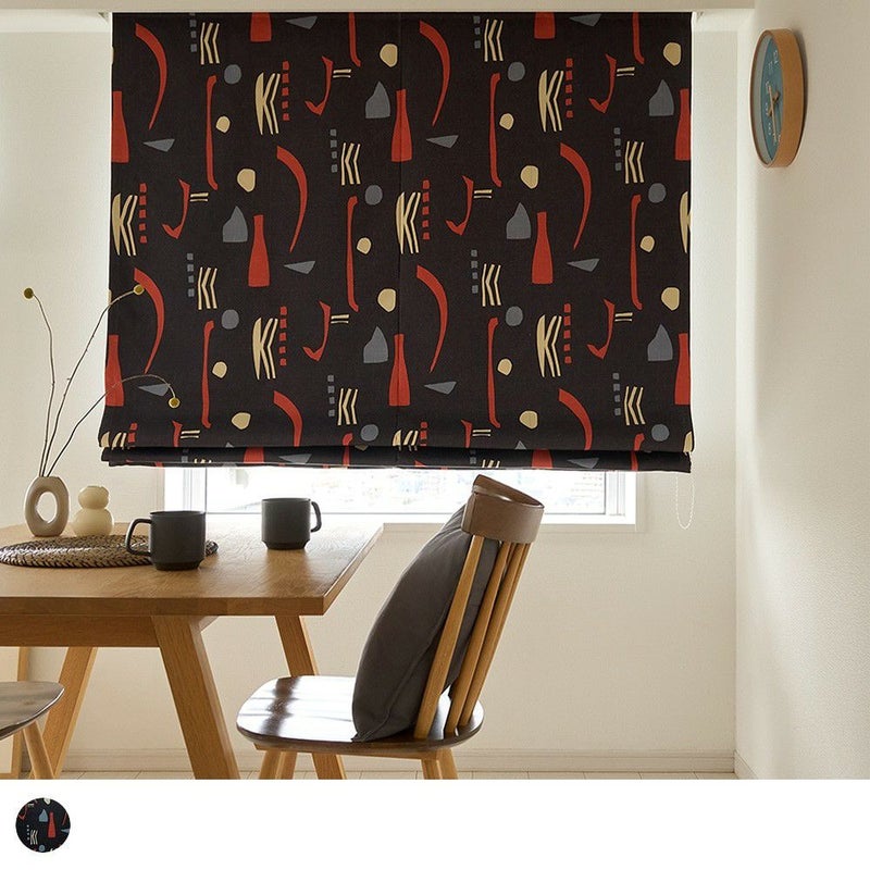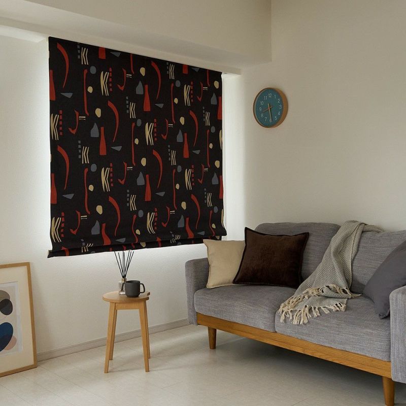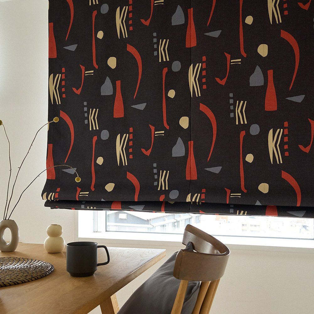 ミッドセンチュリースタイルの当店オリジナルのシェードカーテンが登場! ブラックに鮮やかなレッドが映える、インパクトのあるカラーリングがかっこいい。他とは違う個性的なインテリアを作りたい方にぴったりの、まさにアート作品のような1枚です。そしてこのシェードカーテン、デザインがお洒落なだけでなく、遮光1級・遮熱効果もあるという、かなりの優れものなんです。