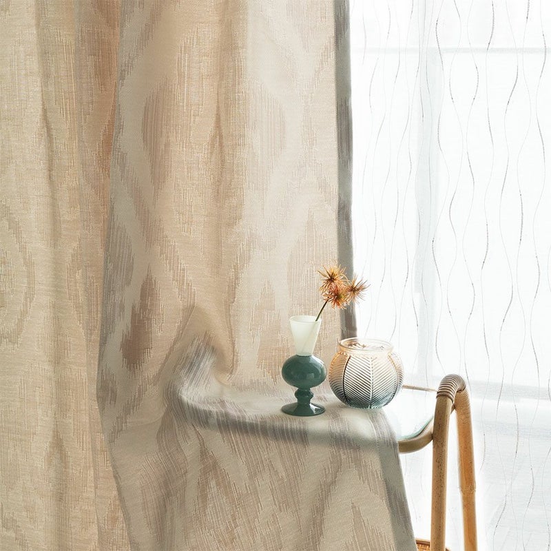 夜は、ドリーミングな世界へと誘う趣のある表情を見せてくれる。照明によるドラマチックな陰影が、深い寛ぎを叶えるこのジャガードカーテン。情緒溢れる寝室で、心地よい眠りを。