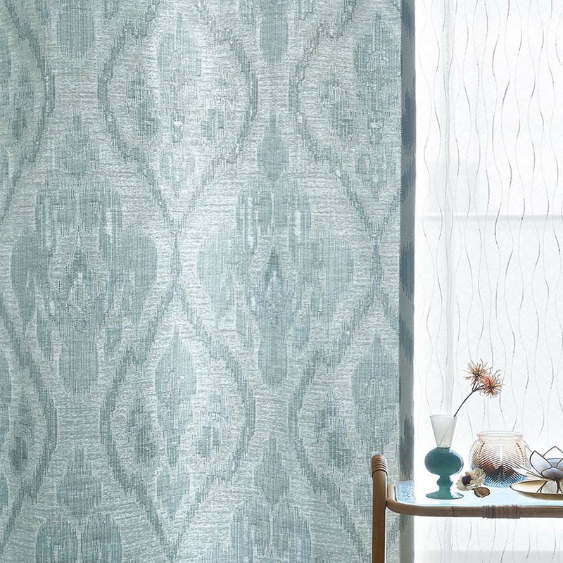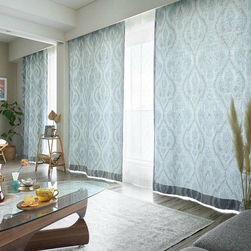 大胆なオーナメント柄でありながら、絣(かすり)で表現された繊細さと、奥行きのある趣を醸し出すデザイン。ヒダのないフラット仕様のカーテンが、大きめな柄を最大限に引き出します。縫製仕様とも好相性な、ダイナミックな一枚。