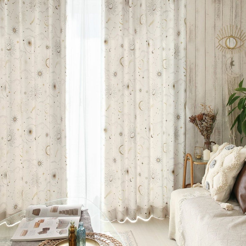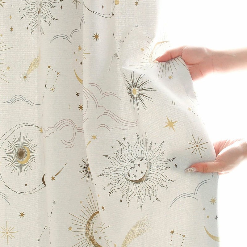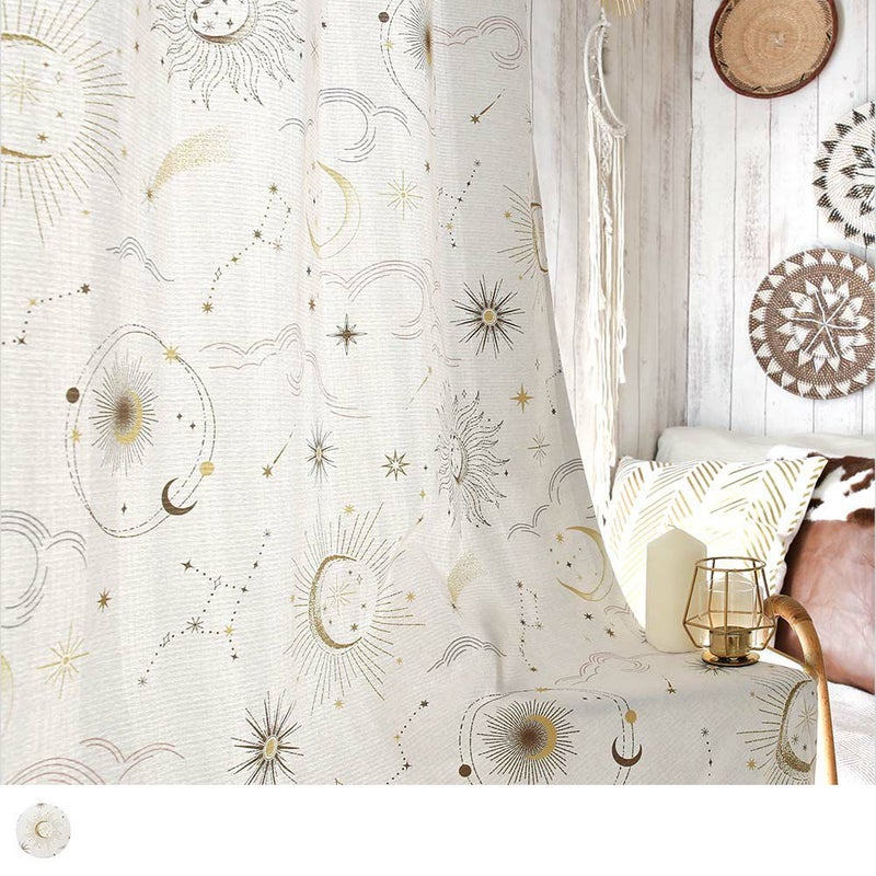 海外では大人気のミステリアス、セレスチアルチックのデザイン。モチーフは神聖な天国に住むお星さまや太陽、月などを繊細的なタッチで表現しました。アイボリーベースでゴールドのミックスカラーをインクジェットプリントで表現したので、木目などBOHOインテリアの家具や雰囲気とも馴染みが良いです。
