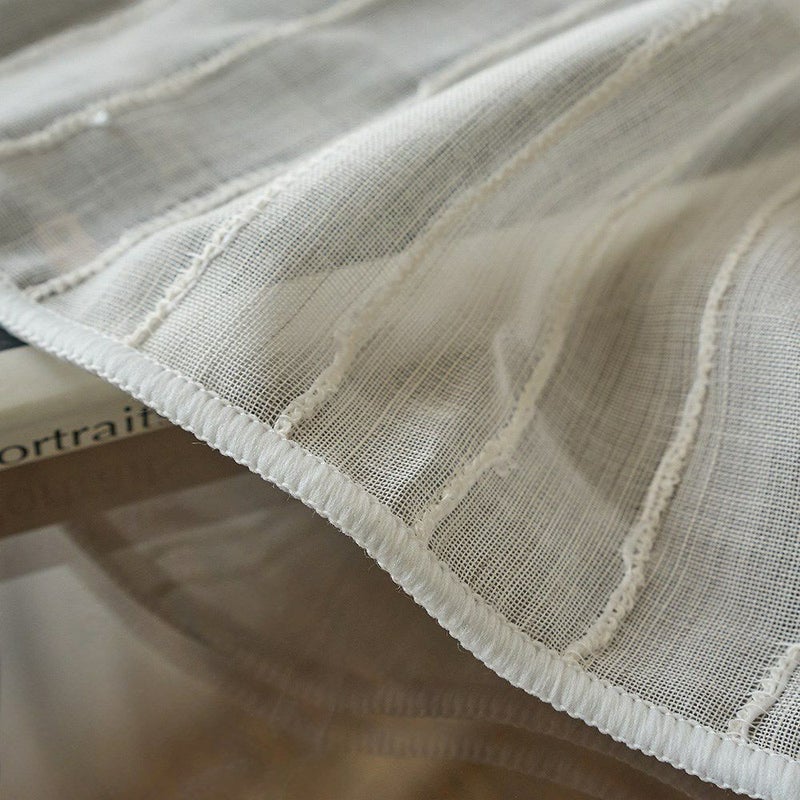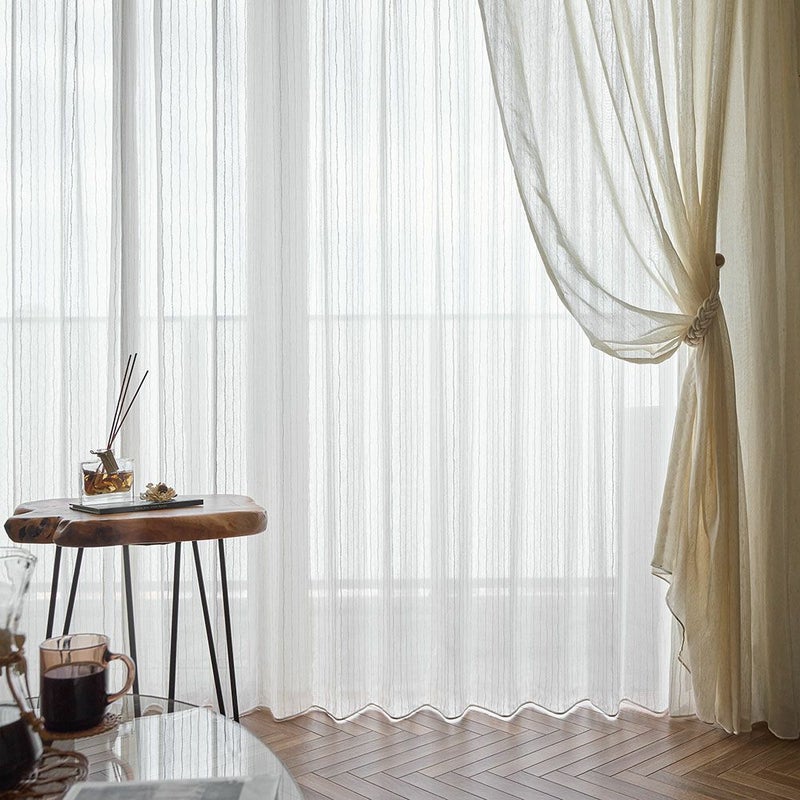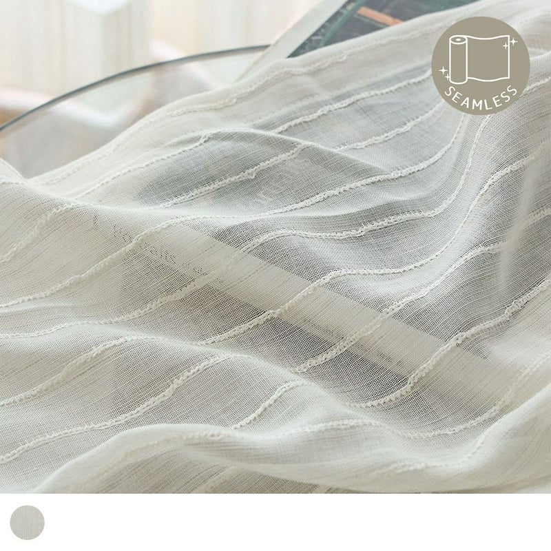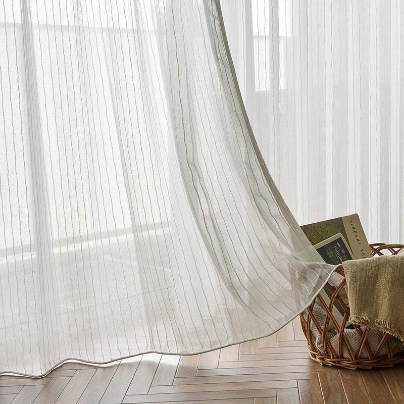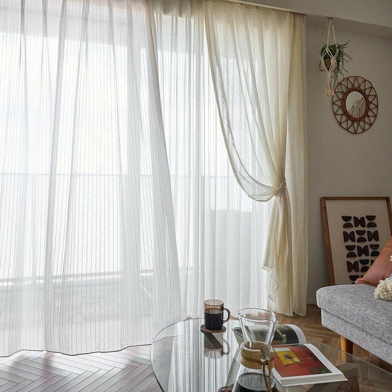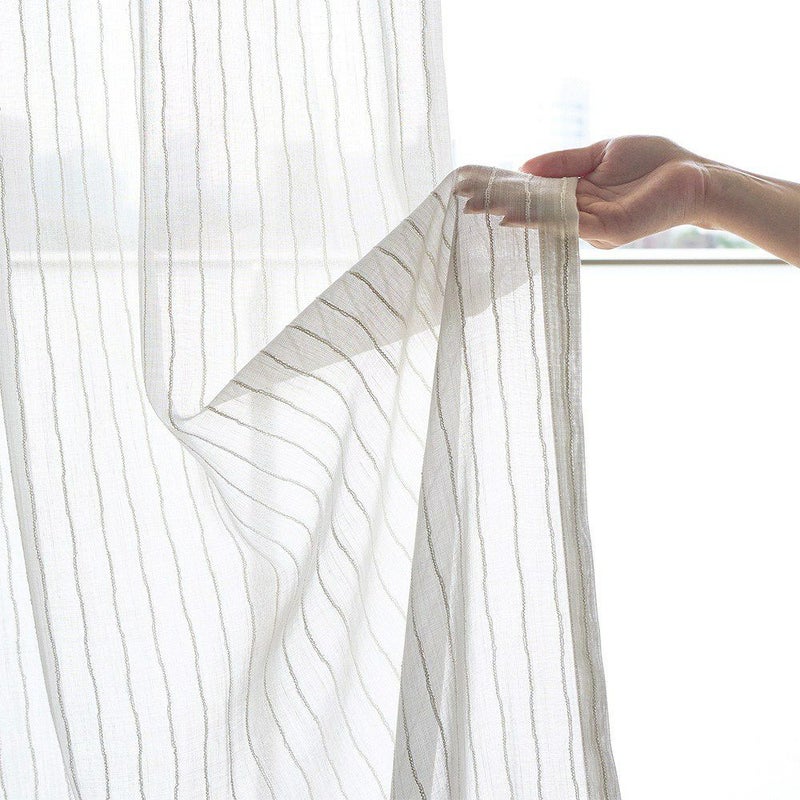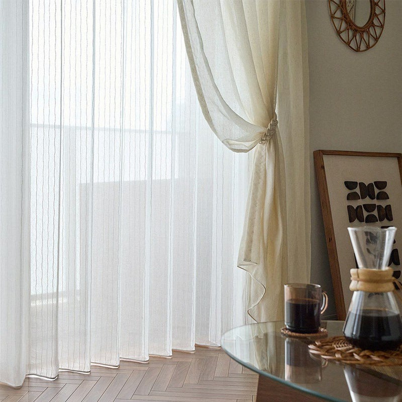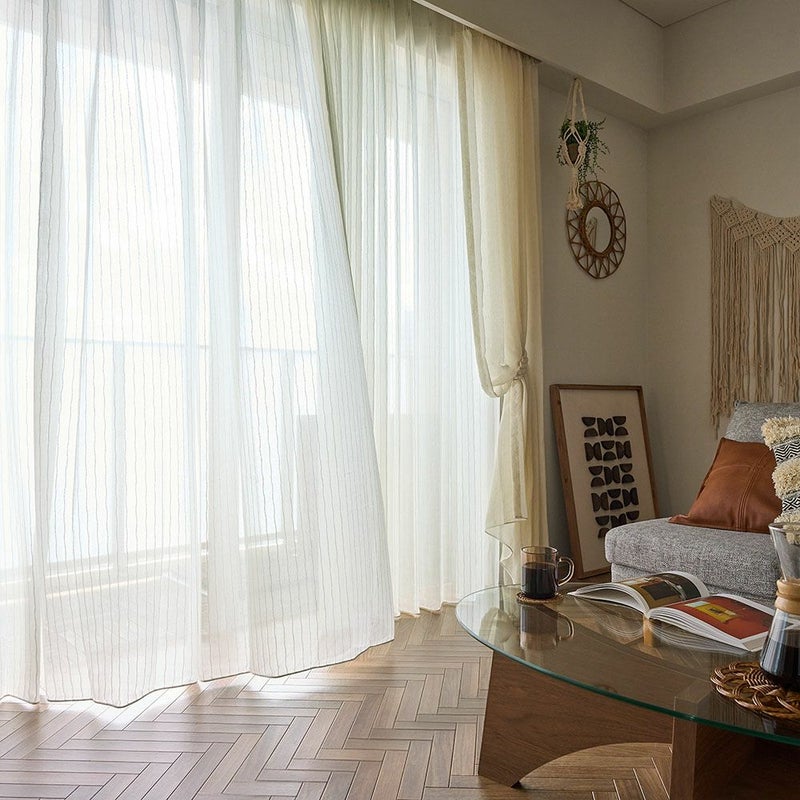 ナチュラルなストライプと意匠糸の表情が絶妙に組み合わさった<ベルナ>は、光や風に揺れるたび窓辺に柔らかな陰影と奥行きを作ります。BOHOらしいラフさと上品さを兼ね備え、ナチュラルな空間にも自然になじむデザイン。ストライプが窓辺にリズムと立体感を与え、日常にさりげない動きと小さなときめきを添えてくれるレースカーテンです。