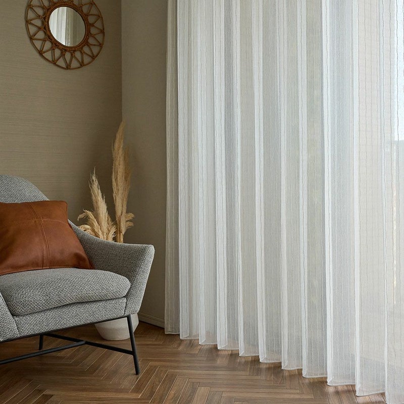 表情豊かな意匠糸で描かれたストライプが、光を通すたびに窓辺に陰影と立体感を生む<ベルナ>。広窓にも美しく馴染むシームレス設計で、巻ロック加工により細部まで丁寧に仕上げています。防炎・ウォッシャブル仕様で暮らしに安心感を添え、ヴィンテージ家具やアートのあるBOHO空間に自然に調和。光と風を柔らかく取り込み、窓辺から暮らしに上質な余白と小さなときめきを運ぶレースカーテンです。