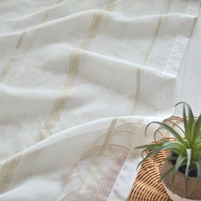シャンパンカラーのストライプラインに、立体感のある糸を縫い合わせたデザインが、繊細で奥行きのある表情をつくるレースカーテンです。光を受けるたびにほんのりと輝くラメ糸が、空間にやわらかな陰影とさりげない華やかさをプラス。幅広仕様のボイルレースは、ふんわりとした透け感と美しいドレープを演出し、BOHOやナチュラルなインテリアにもしっくりと馴染みます。毎日の風景に、ちょっとしたときめきを。