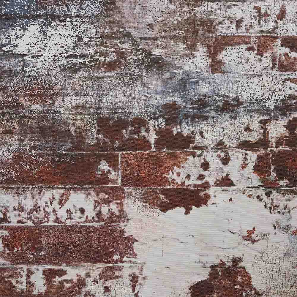 レンガの壁面を思わせる大胆なグラフィック。その上に、煤(すす)で描かれたような女性の顔。