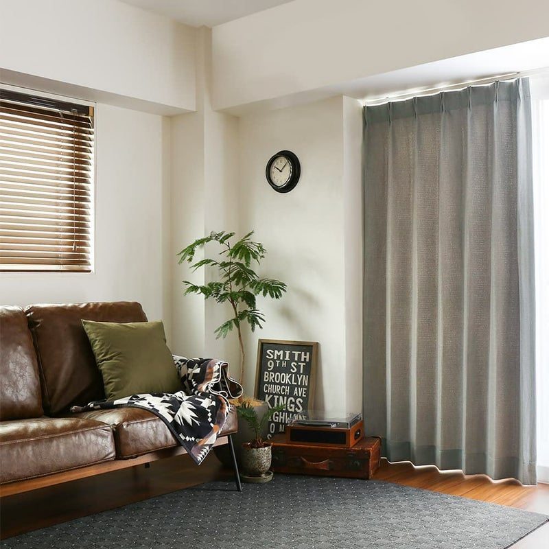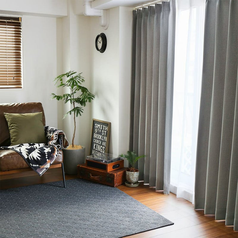 どのカラーリングもインテリアにも馴染みやすい色合い。暗くなりすぎずに程よく肩の力を抜いて過ごせる。 コテコテの男前インテリアをライトな印象に仕上げるには、このカーテンで決まりだ。