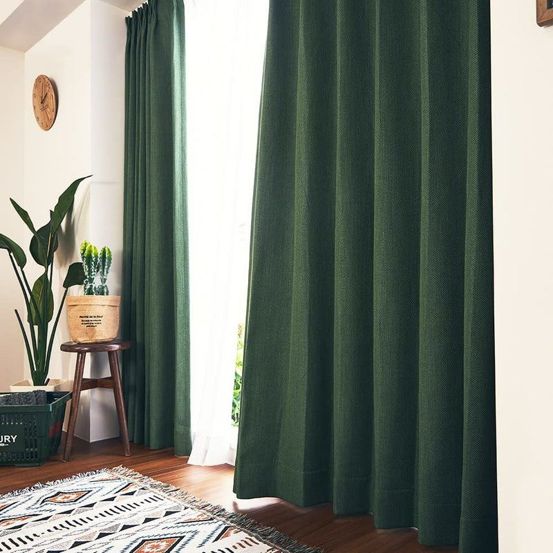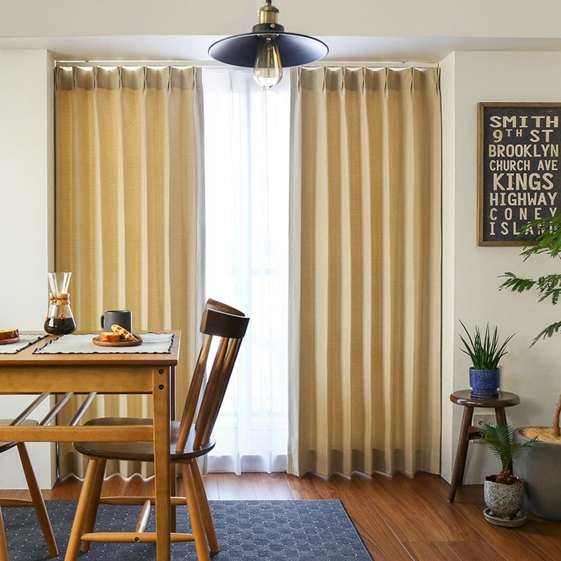 シンプルな無地調のカーテンは、近くで見るとざっくりと織られており、愛着の湧く1枚に。裾の広がりを抑える形状記憶加工付きなので、奇麗なウェーブ感も楽しめるオーダーカーテン。