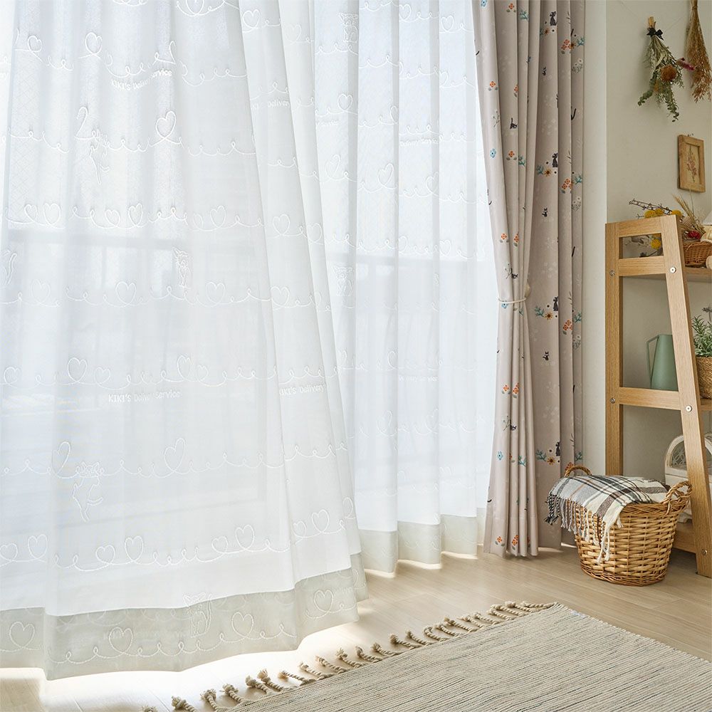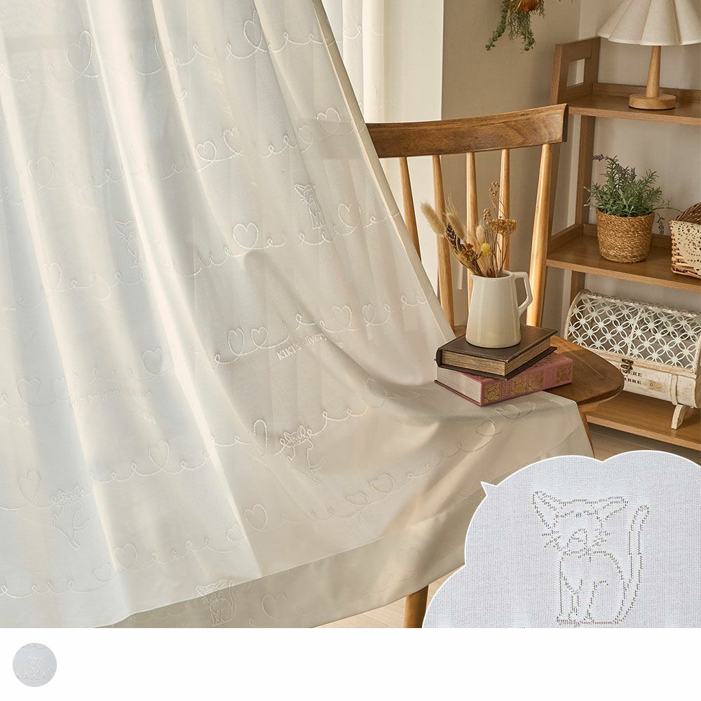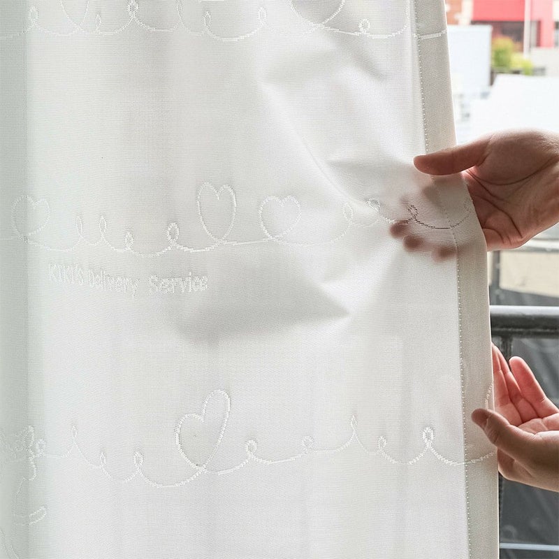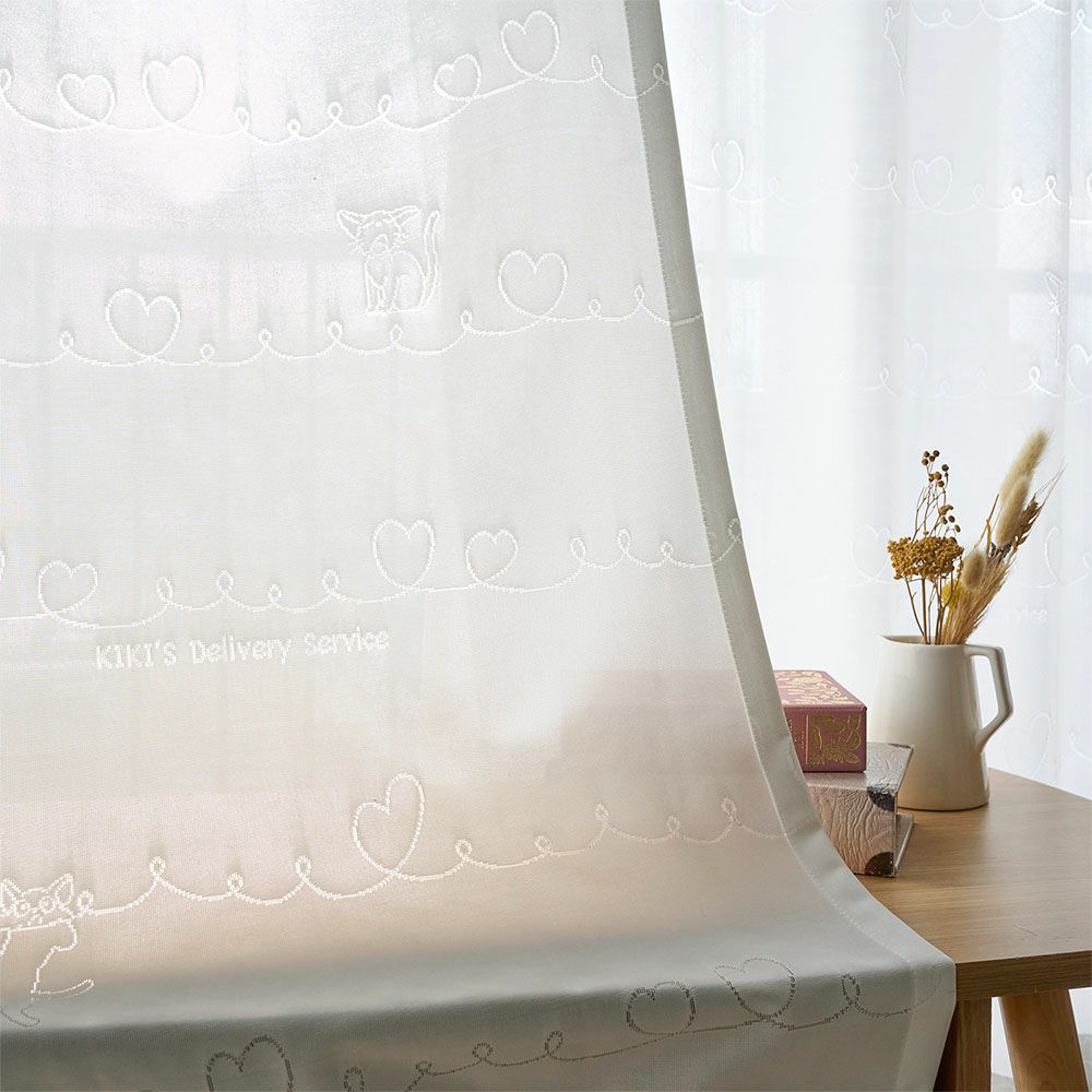 魔女の宅急便に登場する黒猫ジジがハートに囲まれた、キュートなレースカーテンです。自由気ままに過ごすジジたちの姿にキュンと癒されるデザイン。ラフに描かれたハート模様が、カーテンいっぱいに続き、幸せを窓辺に広げます。
