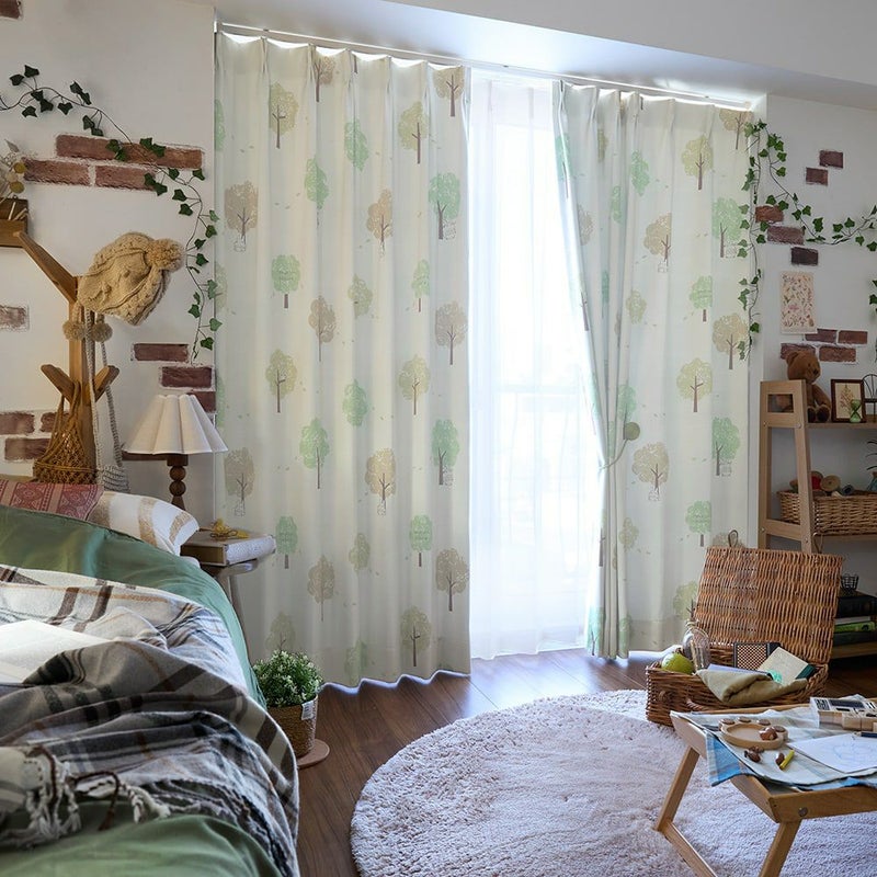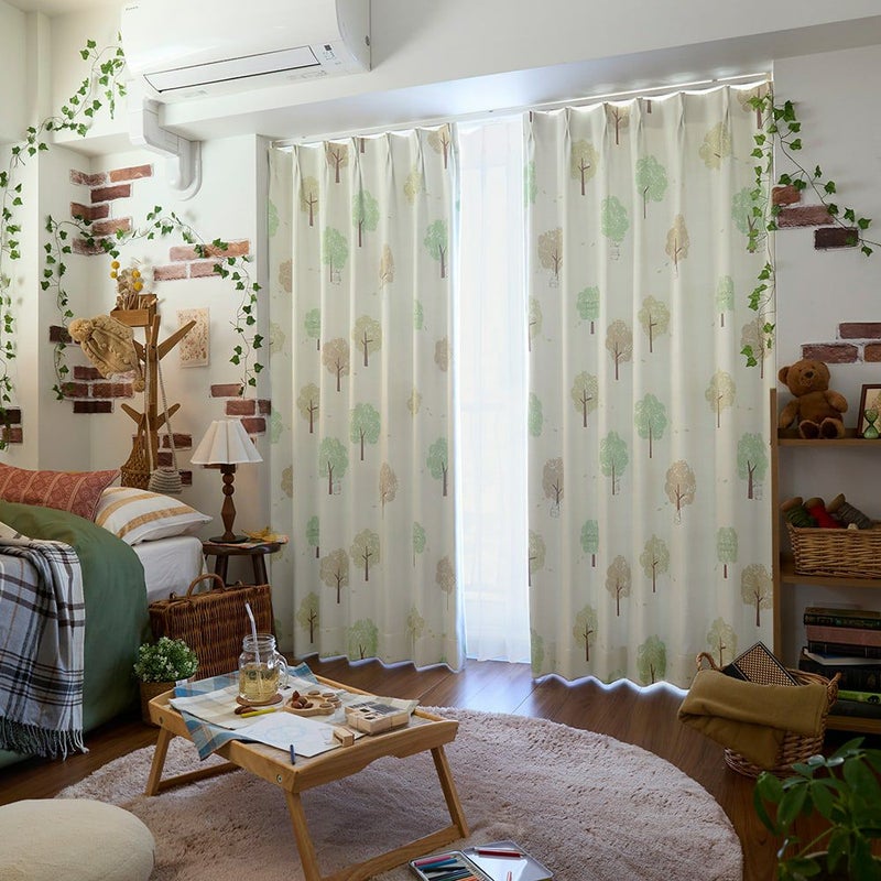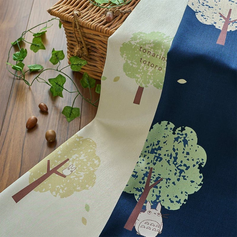 トトロたちが森で過ごす様子を描いた遮光カーテン「くすの木と風」。映画のつづきを見ているような、ジブリの世界に没入できるデザインです。楽しいが詰まったカーテンをかければ、いつもの日常に非日常な物語がはじまります。