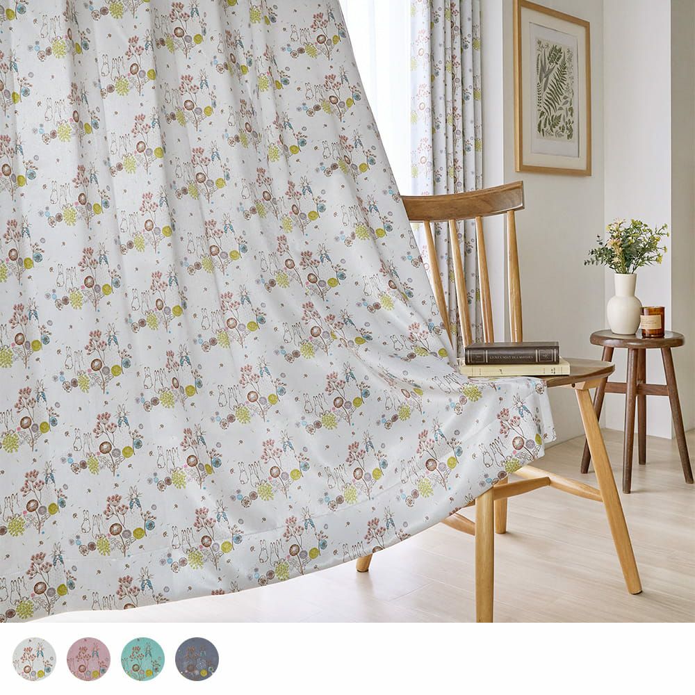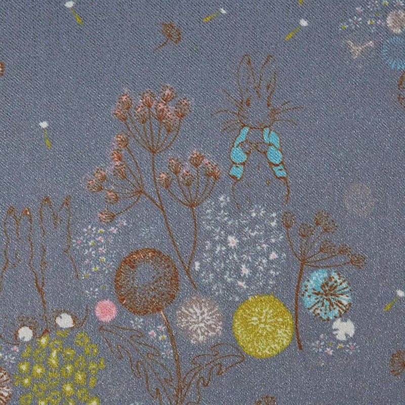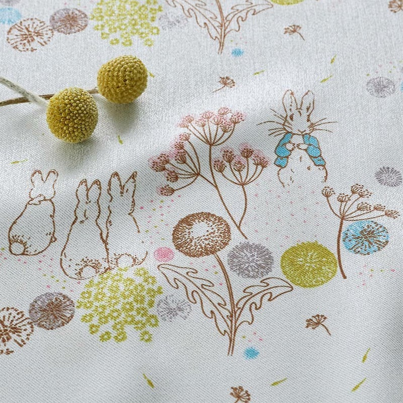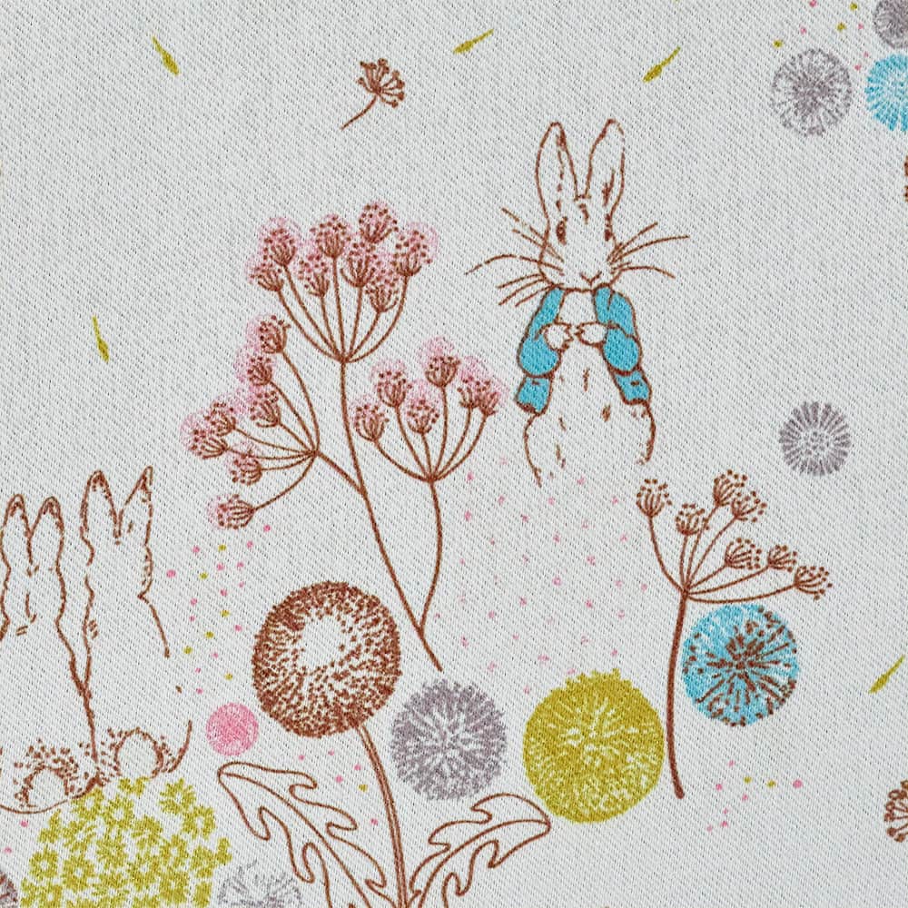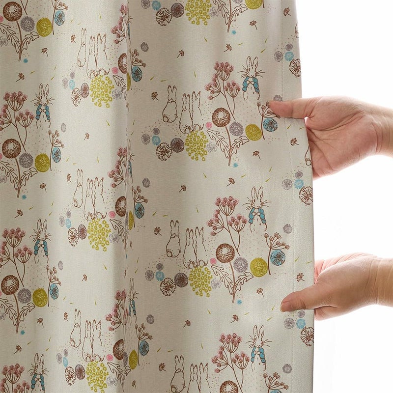 英国の湖水地方の美しい自然。その野原でピーターラビットたちが駆け回り、ふんわり舞うたんぽぽの綿毛たち。そんな物語の中の1ページを切り取ったような、やさしい空気を運んでくれるカーテンです。