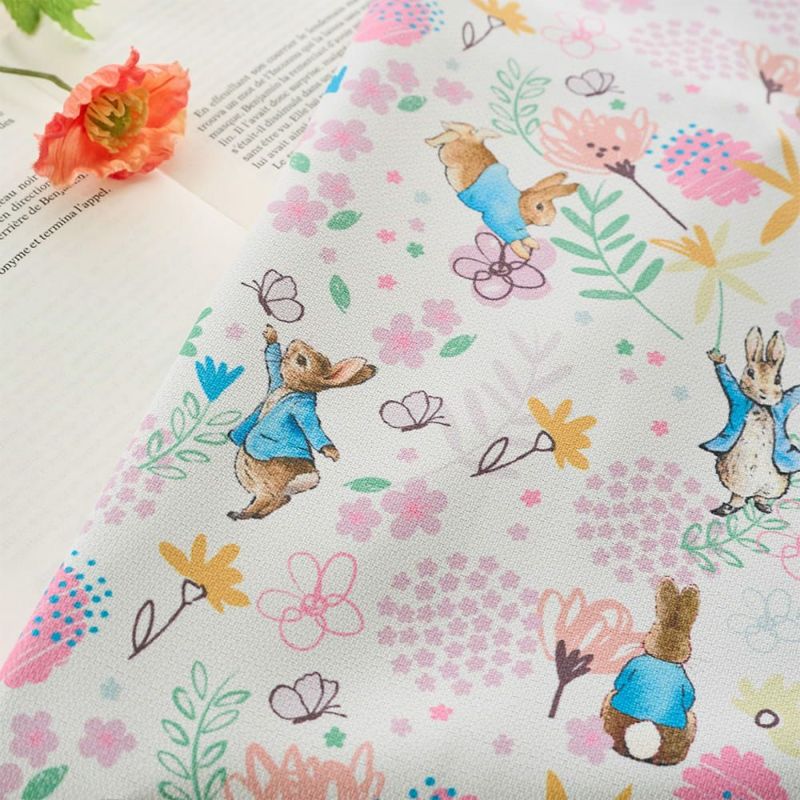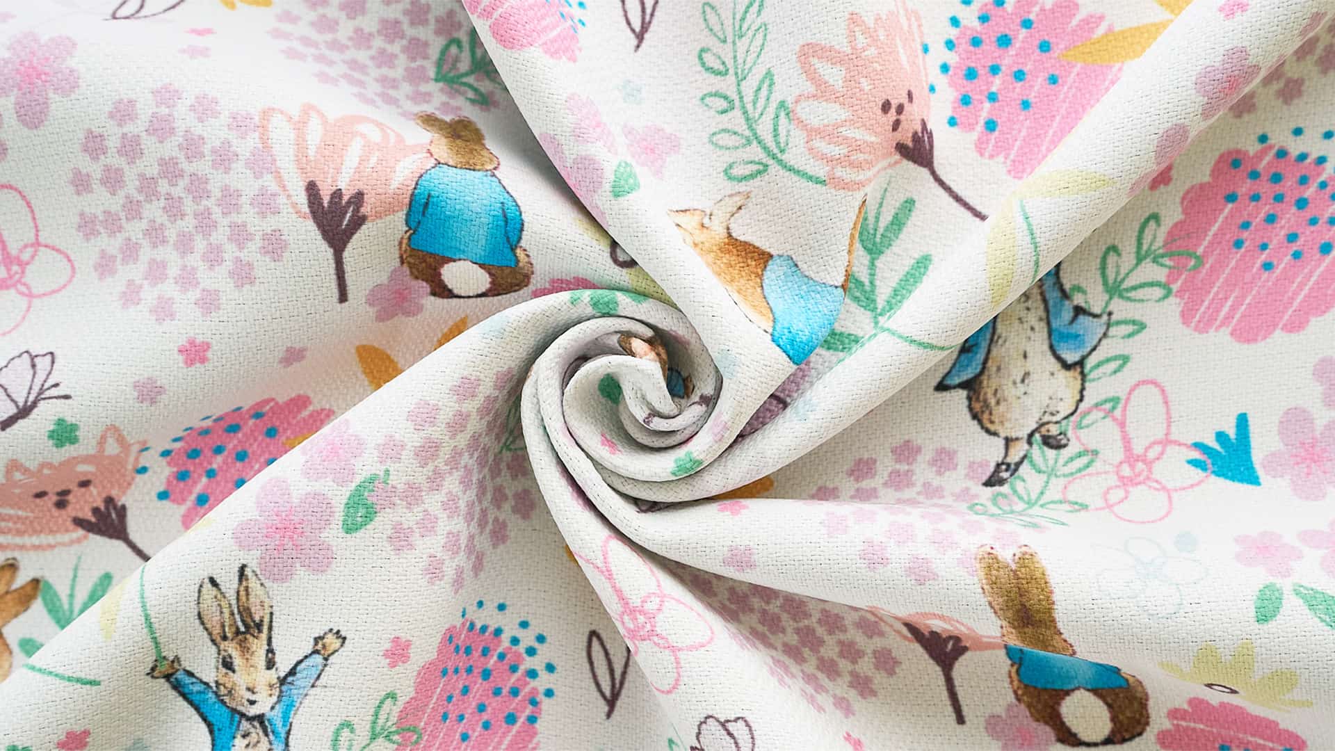 カラフルな色合いが明るくにぎやかなお花畑で、ピーターラビットが楽しくお散歩中。明るいカラーリングは、やっぱりハッピーな気分になりますね♪