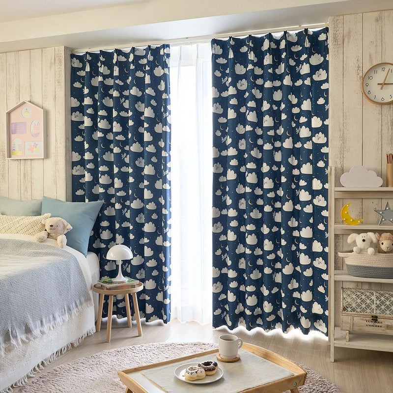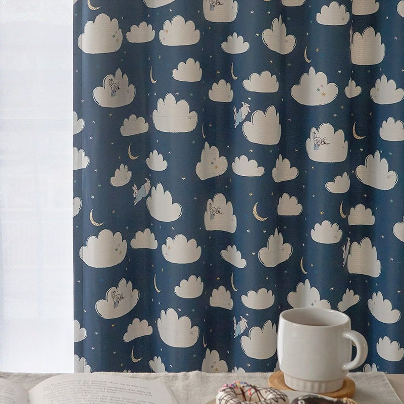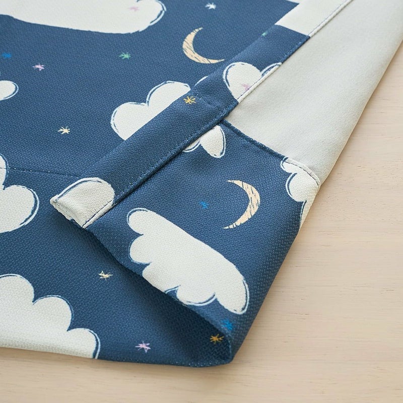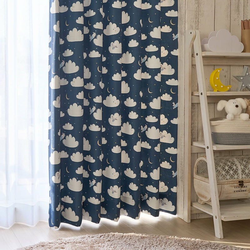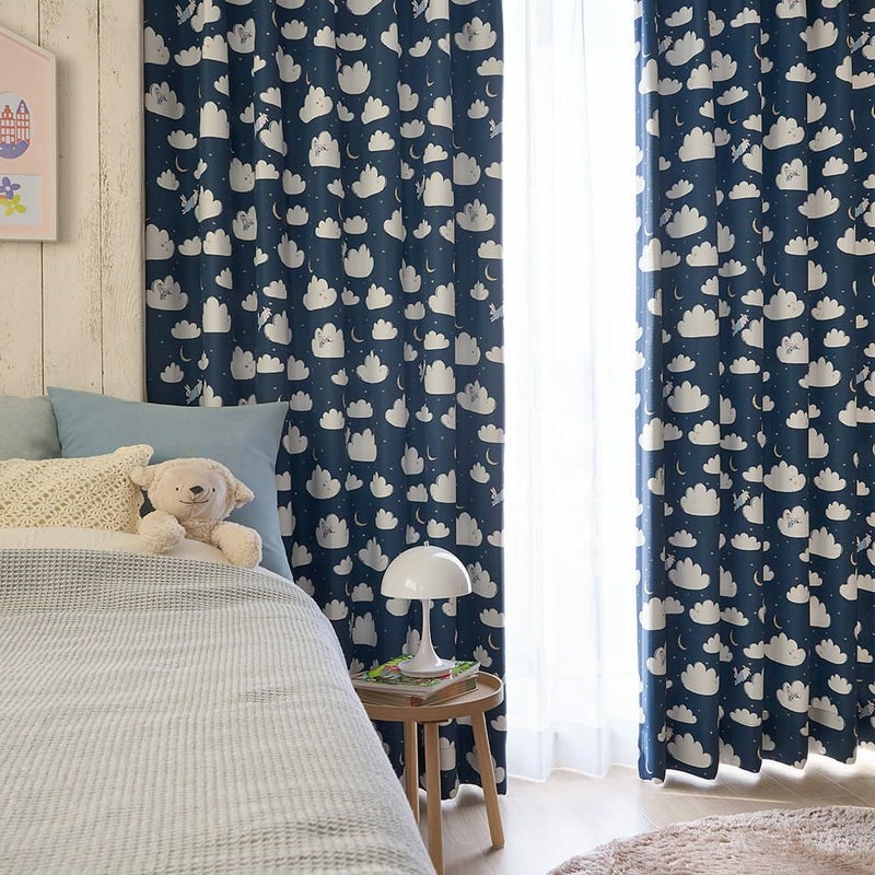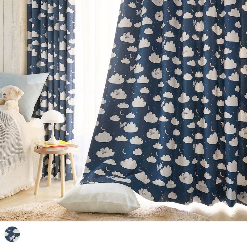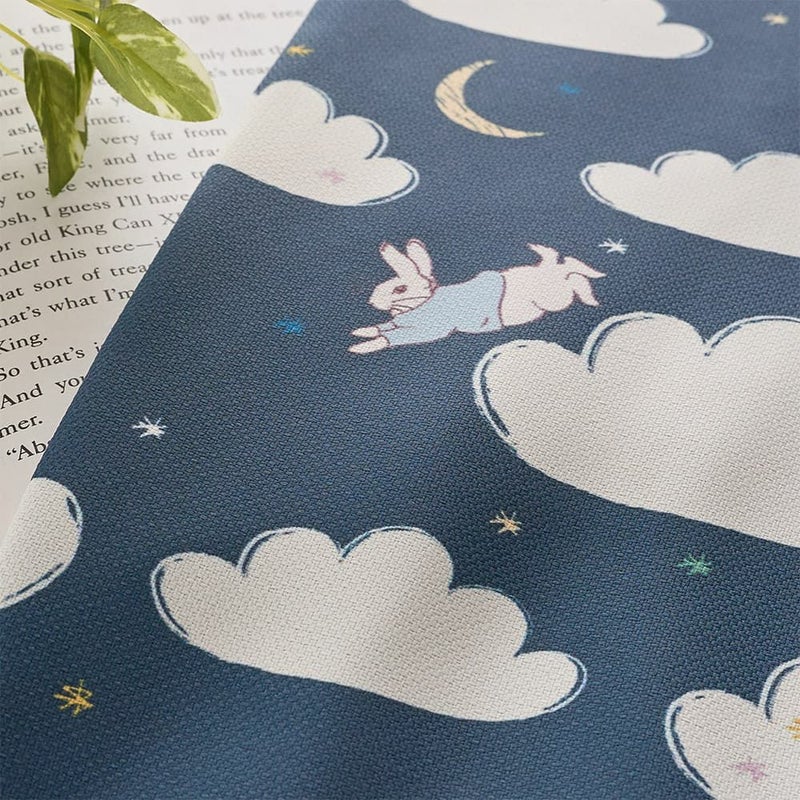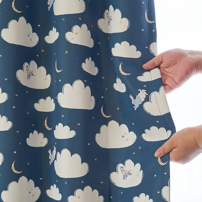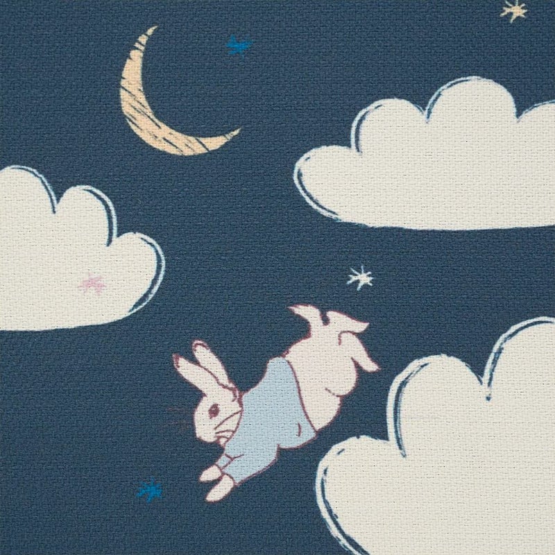 窓辺を見ると夜空にふんわり浮かぶたくさんの雲と、お月さま。ピーターラビットが雲の上をぴょんぴょん飛びながら、雲たちと一緒に遊んでるみたいなカーテン。お月さまや星と遊ぶ、そんな「お空の物語」が、お部屋いっぱいに広がります。さぁ、ピーターたちと一緒にお空のお散歩を始めよう!