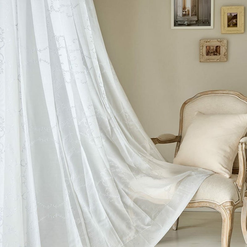 ギリシャ神殿で用いられたアカンサス(アザミの葉)を贅沢に施した刺繍レースカーテン「ルミエール」。意外と目にとまることが多いレースカーテン。シンプルな無地も素敵ですが、昼間の窓辺では刺繍レースが主役になります。だからこそ、高貴で華やかな刺繍レースをプラスしてみませんか?神聖な植物として長く愛されるアカンサスパターンのレースで、古き良きシャビーシックな空間を叶えよう。