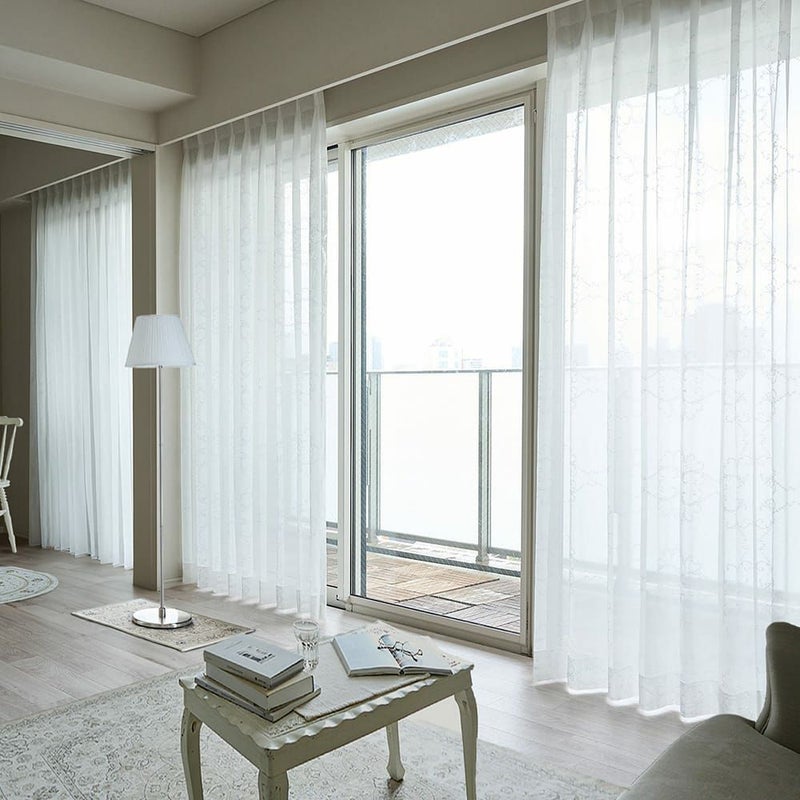 レースカーテンのプリーツを均等で美しく整える加工を施しており、ヒダ山と谷のカーブを大切に整えながら、美しいドレープを楽しんでいただけます。