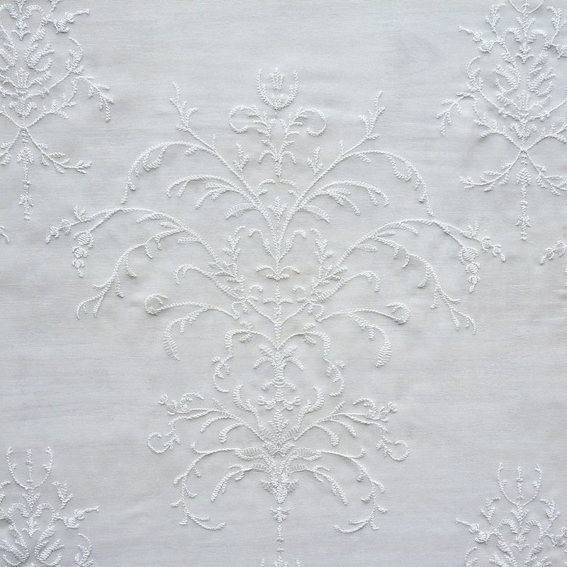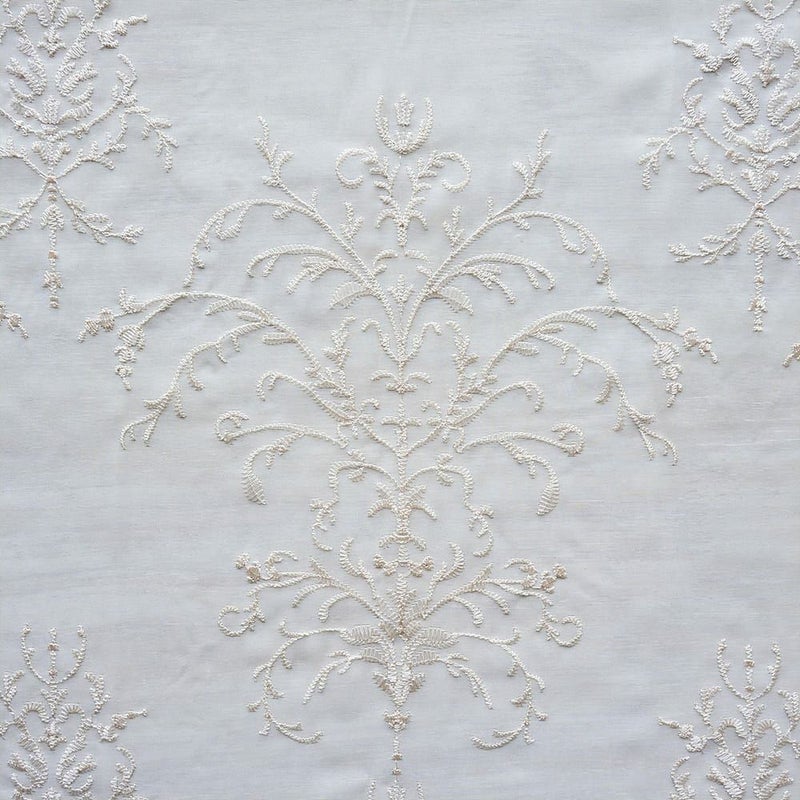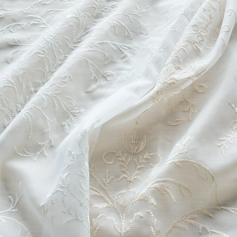 愛され続けるオーナメント模様を、アーティスティックにレースに刺繍しました。繊細な刺繍はインテリアに溶け込みやすいようにベースカラーと同系色の糸を使用しています。古典的でシャビーシック感溢れるレースでお洒落な空間作りをお楽しみください。