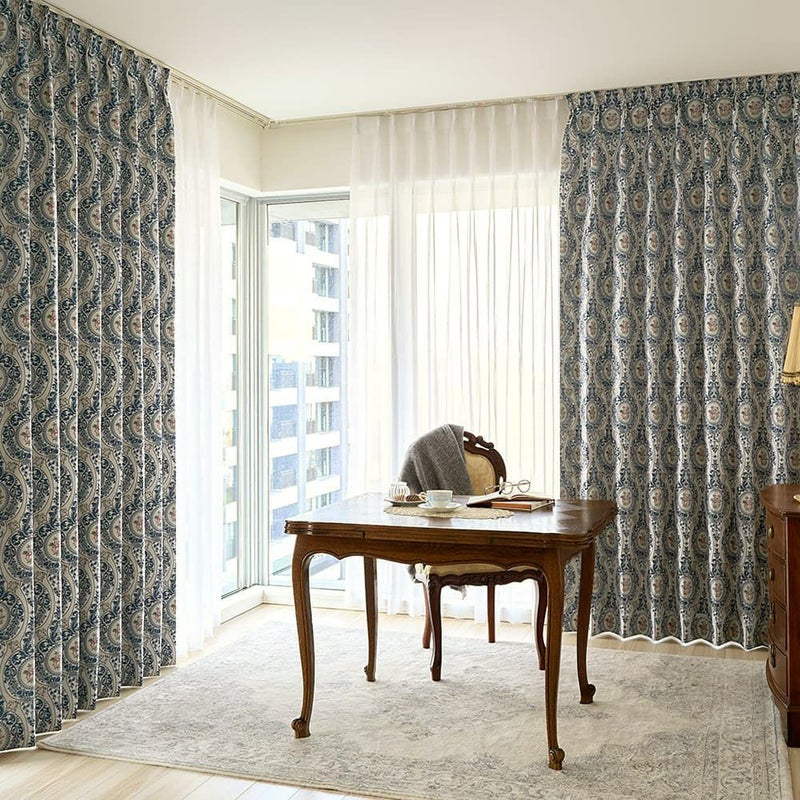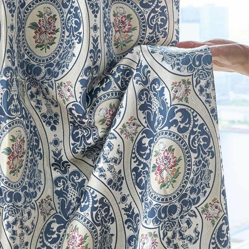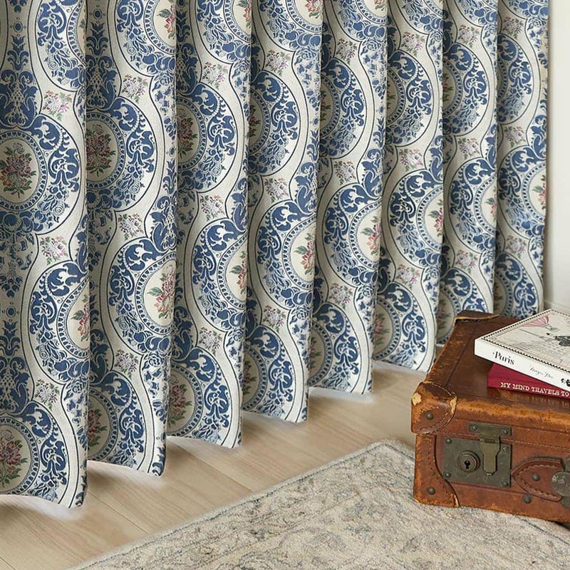 高級感のある先染めのアイボリー糸と落ち着きのあるロイヤルブルーを組み合わせた、精巧で美しいメダリオン模様のカーテン。その繊細な表情は、お部屋に高貴なムードを演出します。