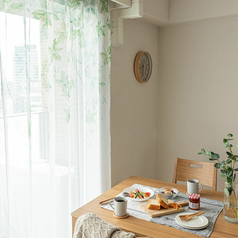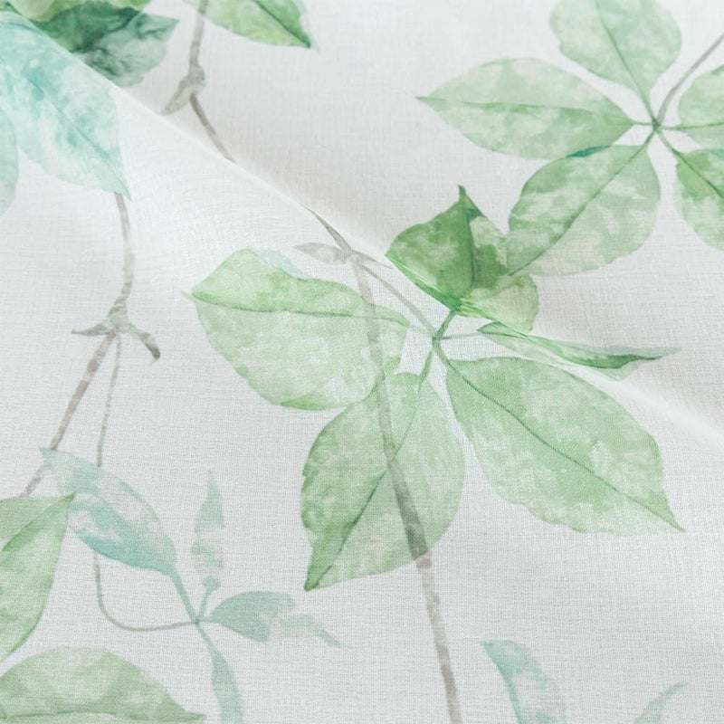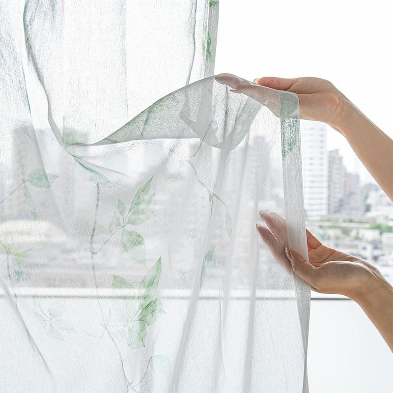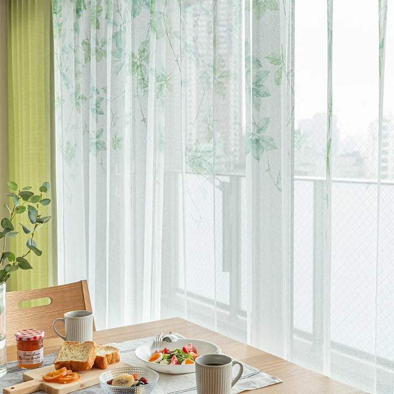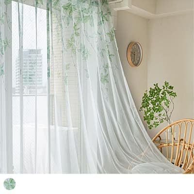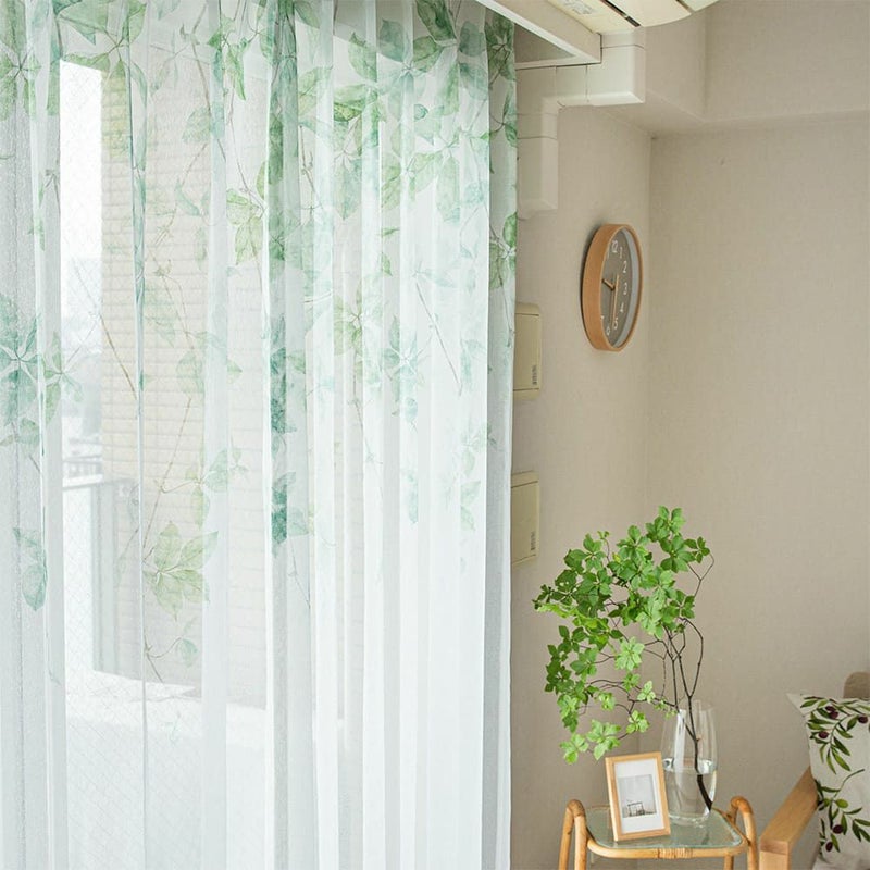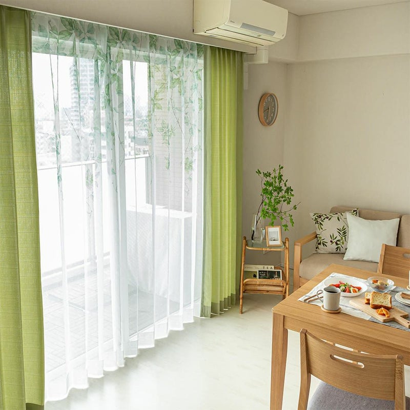 鮮やかなグリーンのリーフデザインがナチュラルに窓辺に広がり、風と自然光を通すたびに感じる心地の良い空間。思わず眺めていたくなるような、そんな癒しのレースです。