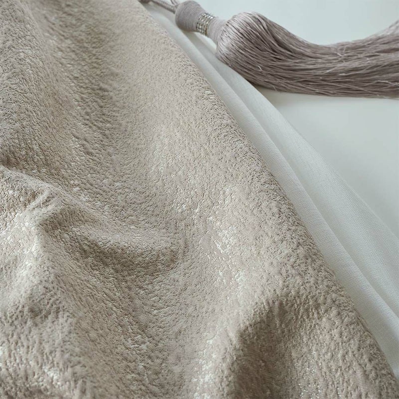 柔らかな光がふくれジャガードの陰影をなぞり、静かに艶を放つ窓辺のカーテン。昼の明るさの中にも深みを宿すその佇まいは、空間に凛とした気配を漂わせる。光沢糸がほんのりと反射し、角度によってかすかな煌めきを描くその一瞬は、何気ない日常の光景に豊かさを感じさせる一枚。