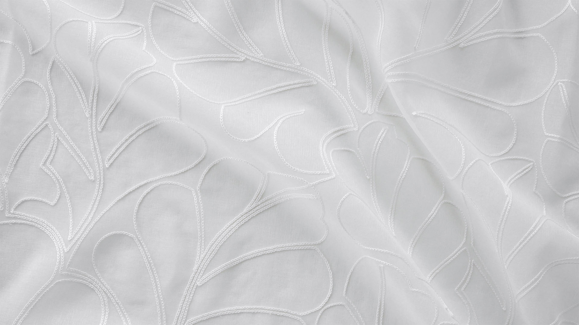 大きく広がる葉を一枚一枚、丁寧に刺繍で表現したレースカーテン。植物の輪郭や葉脈の有機的なラインが一面に広がり、窓辺を優雅に彩ります。光を受けて浮かび上がるデザインが空間に奥行きをもたらし、洗練された印象でありながら技巧が光る特別なオーダーカーテン。