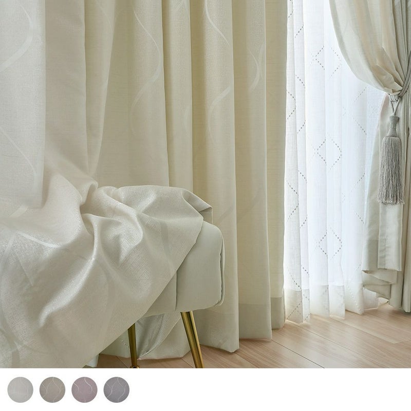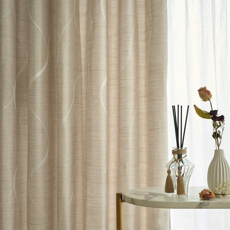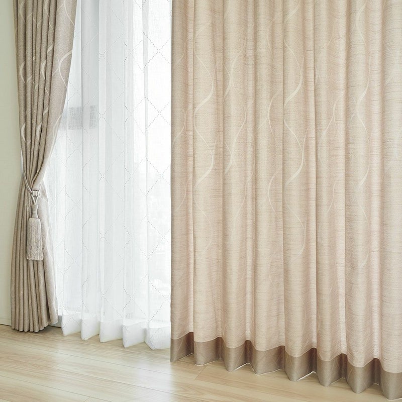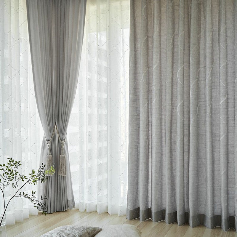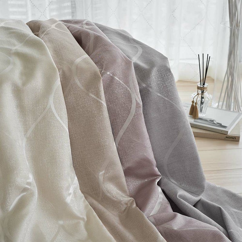 光沢を帯びたおおらかな曲線が、窓辺に静かな動きを描くウェーブデザイン。また、日差しを透かして浮かび上がるスラブ糸の“フシ”が、陰影となって表情を変え、穏やかなアクセントを添える。無地調の穏やかさがありながら、織りの美しさが息づく、品格を装うカーテン。