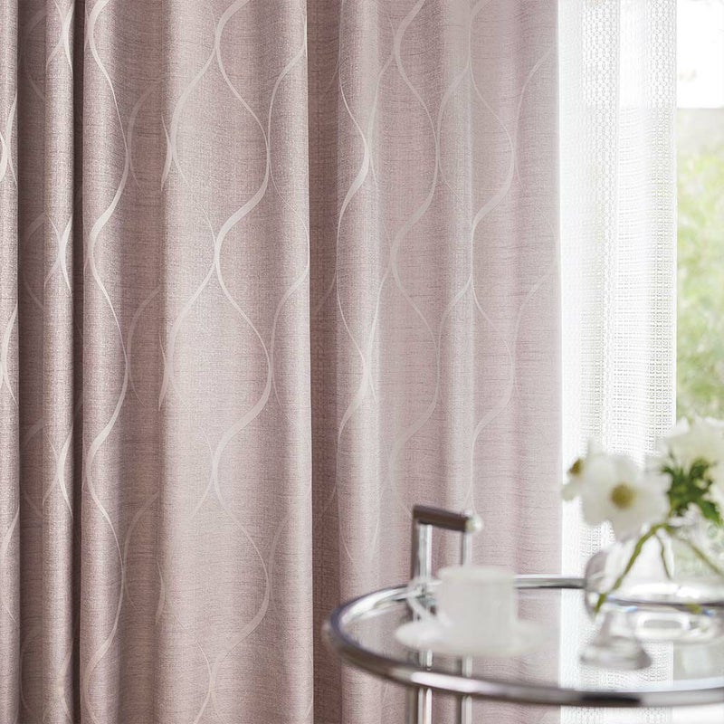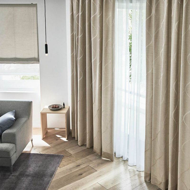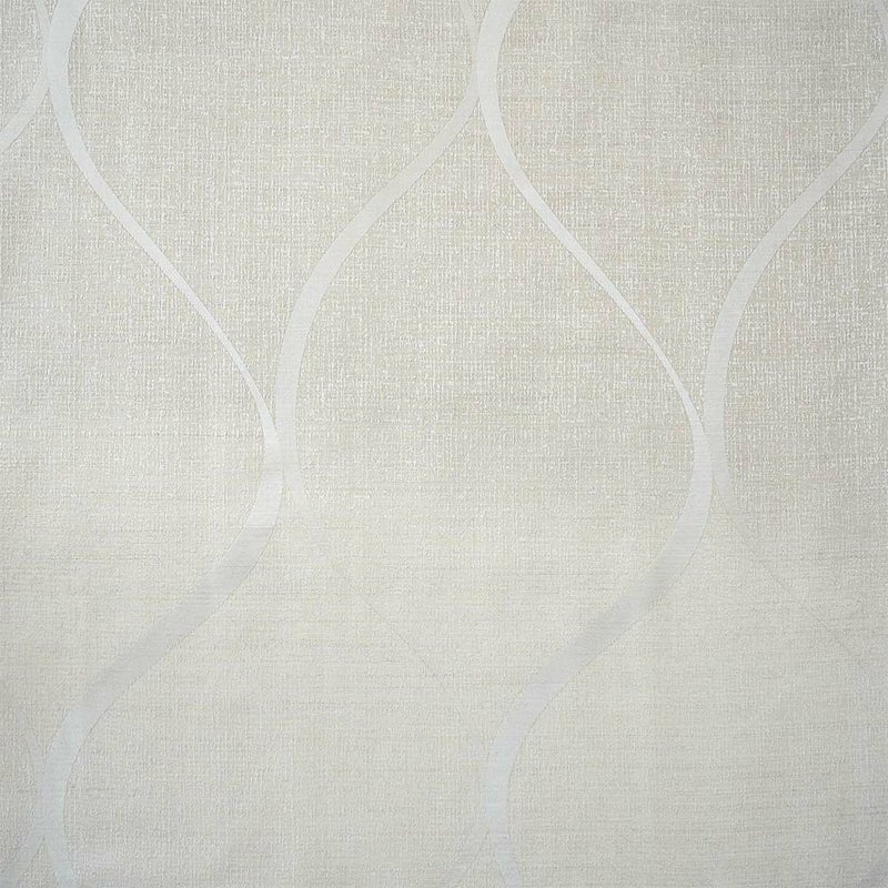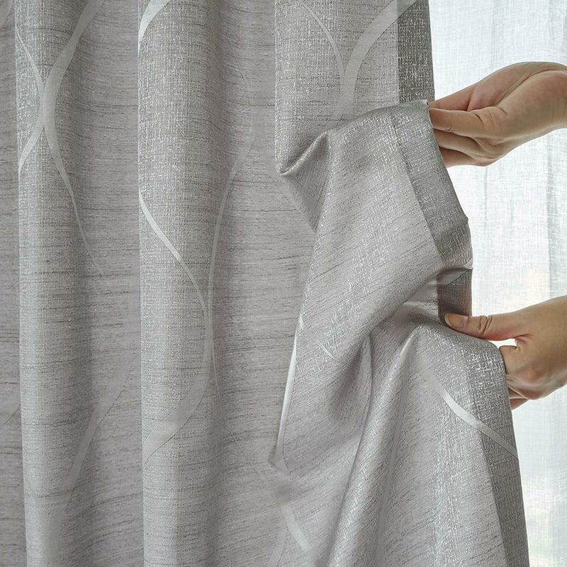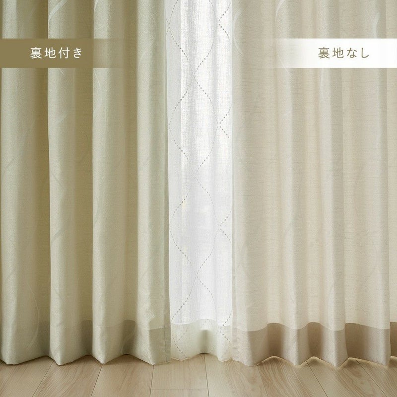 光沢を帯びたおおらかな曲線が、窓辺に静かな動きを描くウェーブデザイン。また、日差しを透かして浮かび上がるスラブ糸の“フシ”が、陰影となって表情を変え、穏やかなアクセントを添える。無地調の穏やかさがありながら、織りの美しさが息づく、品格を装うカーテン。