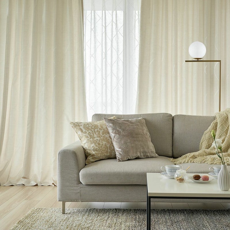 やわらかな光沢とおおらかな曲線が響き合う、非遮光カーテン。地模様には繊細な光沢が散りばめられ、角度によってほのかにきらめきを放つ。スラブ糸の素朴な風合いに、光沢糸の上品な艶が重なり、透け感と陰影が美しい表情を見せる。無地調でありながら、空間にほんの少し華やかさを添える、エレガントなオーダーカーテン。