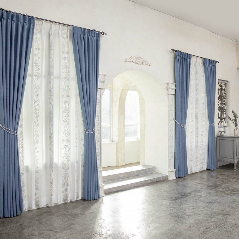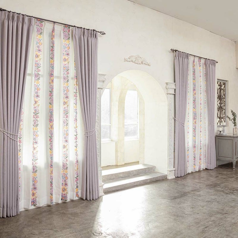 くすみカラーのカーテンとカラフルなレースを合わせる