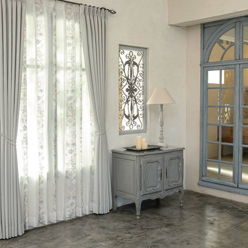 【撮影コーディネート】 レースカーテン <ル リュボン~ピンク~>/2倍ヒダ(3つ山)淡いシルバーはシャビーシックな雰囲気をより盛り上げ、上品な窓辺を作り出す。ただの無地では味わえない、深みのある色合いはこのカーテンならでは。