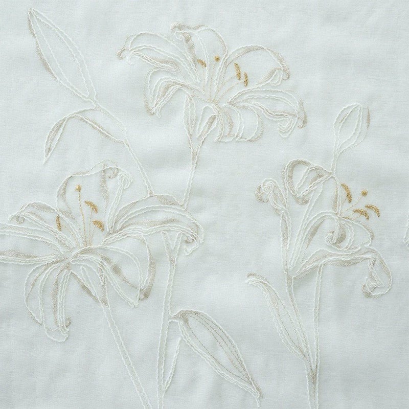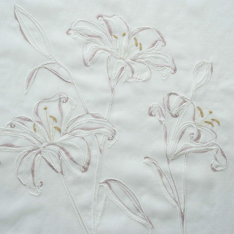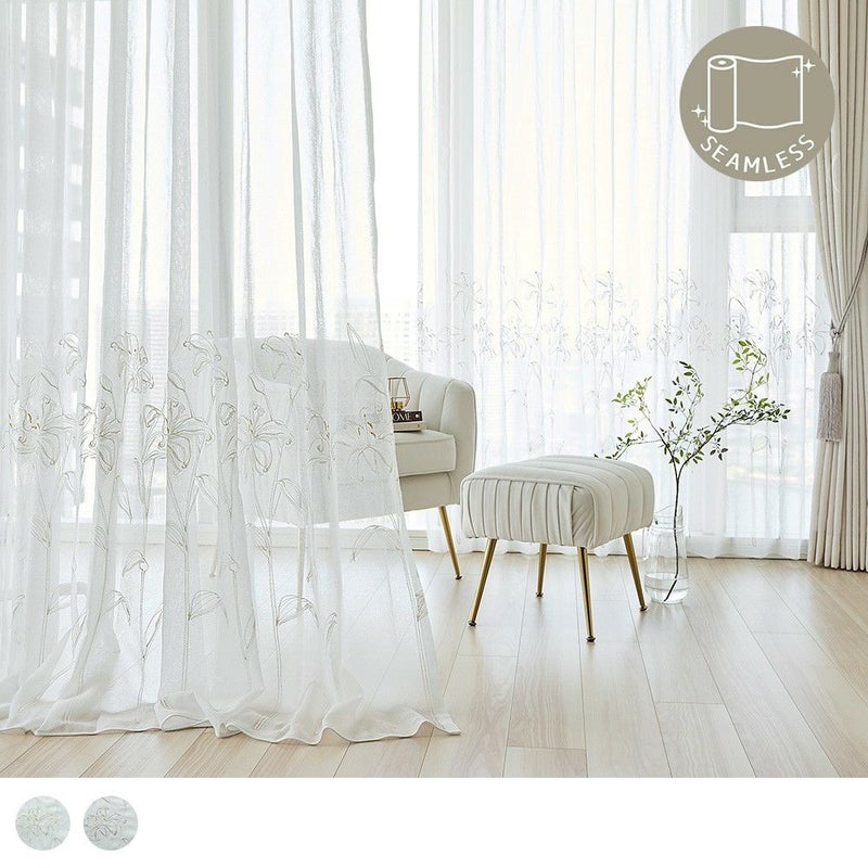 一針一針、凛と咲き誇るカサブランカの花を、繊細に刺繍で描いたレースカーテン。贅沢な刺繍を引き立てるよう、継ぎ目のないシームレス仕様にこだわりました。どんな大きな窓にも美しく広がる一枚仕立てで、窓辺に映える花々の光景は格別。清らかで、気品あふれるカサブランカ刺繍の佇まいが、空間に静けさと華やぎを添える特別なオーダーカーテンです。